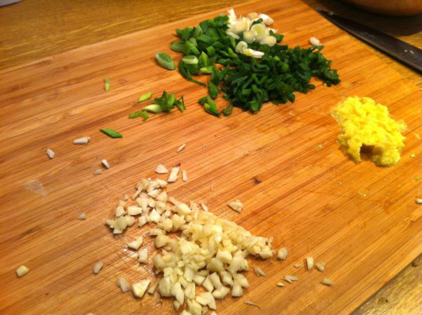 Następnie dodaj drobno posiekany imbir, czosnek i dymkę. Smaż kolejną minutę.