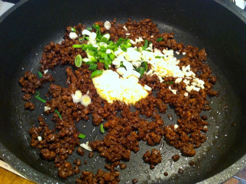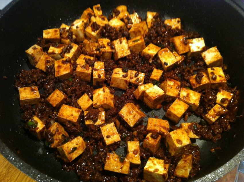 Na koniec do mięsa na patelni dodaj pokrojone w kostkę tofu i delikatnie wymieszaj.