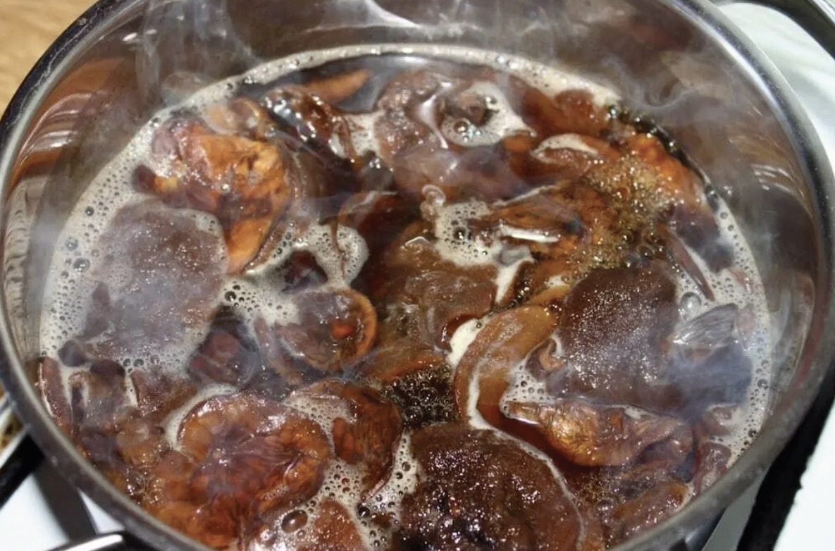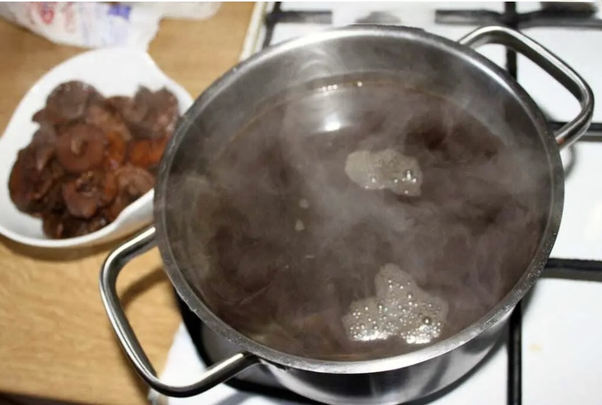 Grzyby namaczaj przez około godzinę w 800 ml gorącej, przegotowanej wody.