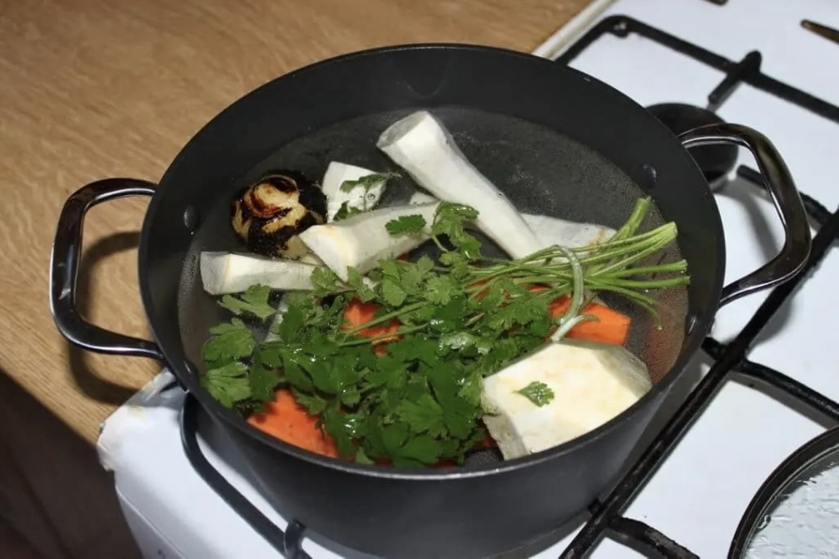 Wywar jarzynowy: marchew, pietruszka, seler, natka pietruszki, opalona cebula (jak do rosołu).