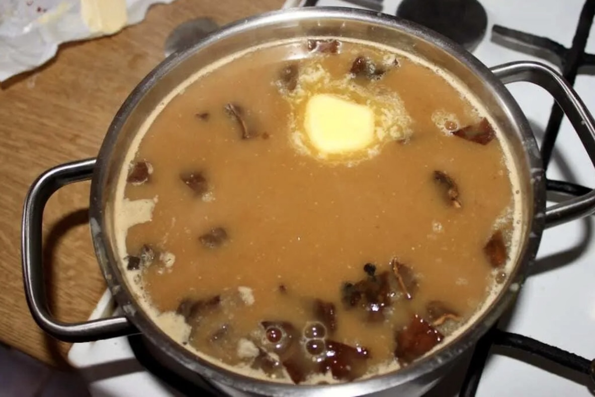 Dodatki: 1 łyżka masła, sól, pieprz (ziarnisty kolorowy i świeżo mielony), ok. 1,5 l wody do wywaru + 800 ml do grzybów.
