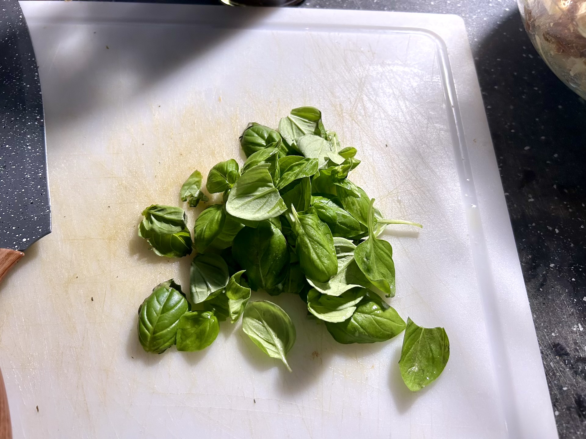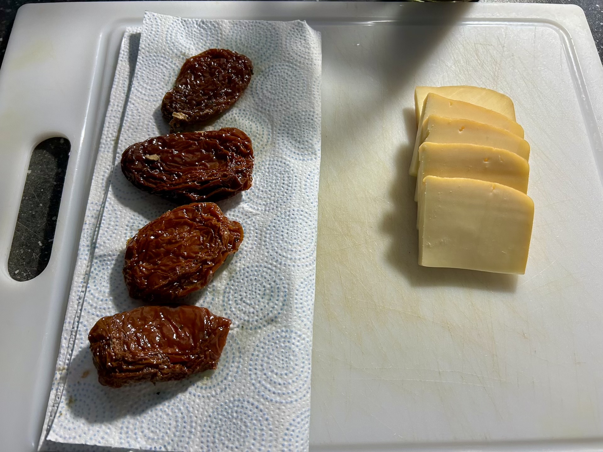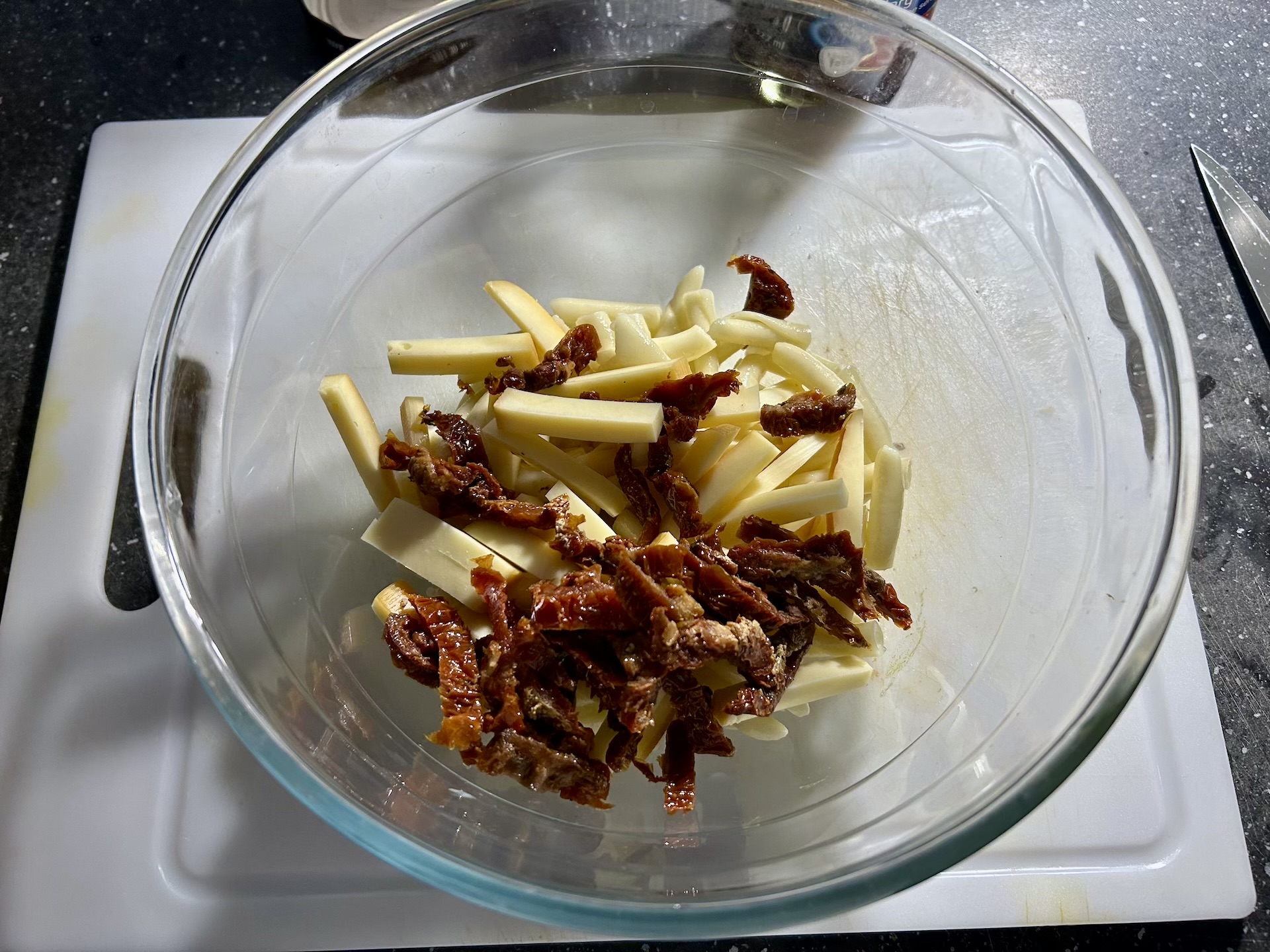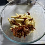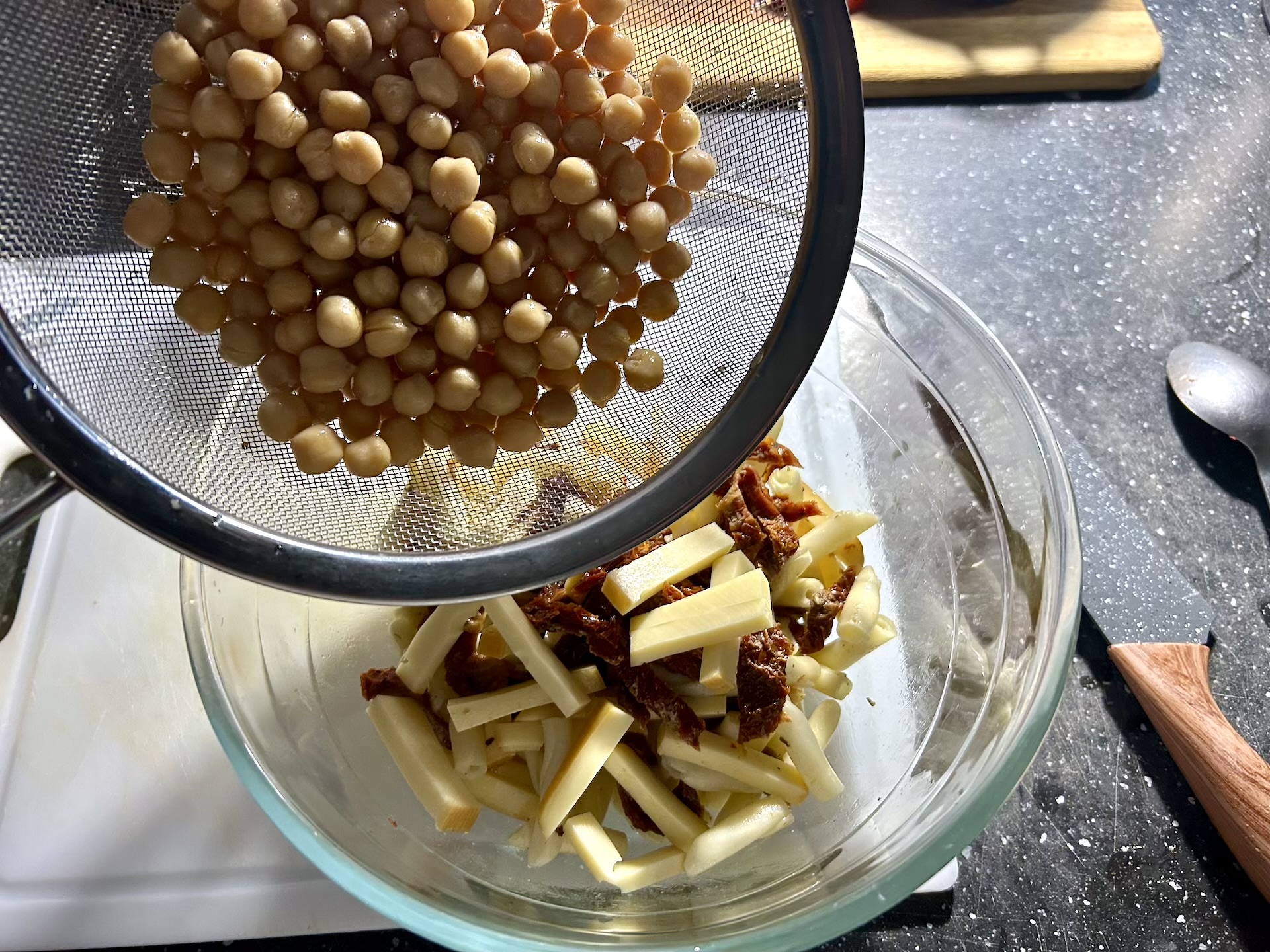 Mieszanie składników: W dużej misce połącz wystudzony makaron, odcedzoną ciecierzycę, ser żółty pokrojony w kostkę lub paski, posiekane suszone pomidory oraz posiekane liście bazylii.