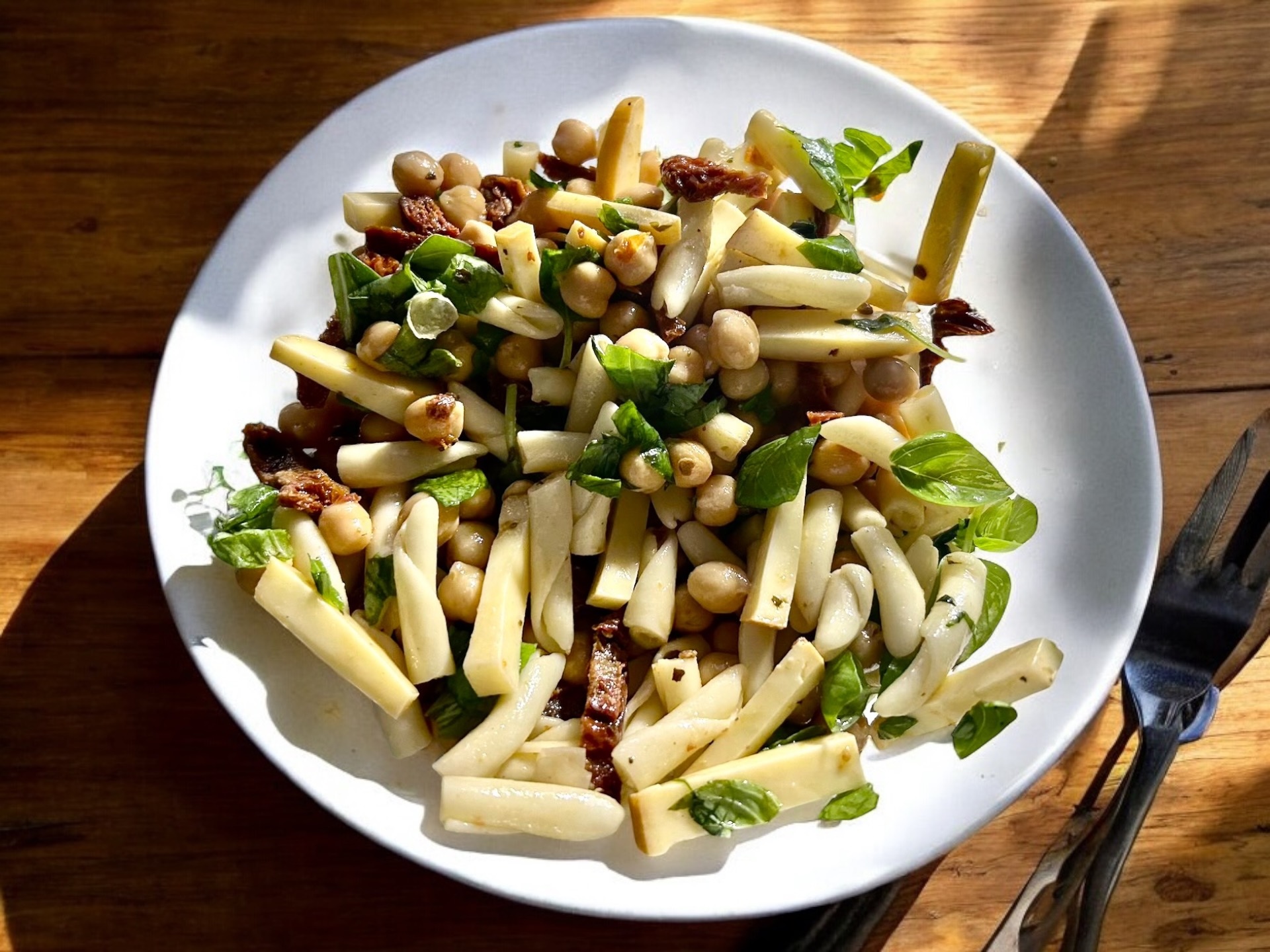 Sałatka z makaronu ciecierzycy i sera z dodatkiem suszonych pomidorów i bazylii to niezwykle ciekawe danie. Zestawienie wymienionych składników razem nie budzi raczej niczyjego entuzjazmu. Sytuacja zmienia się, gdy spróbujemy pierwszego kęsa. Okazuje się, że ta prosta sałatka smakuje naprawdę nieźle. Drugi jej kęs zaczyna nas rajcować, a po trzecim już wiemy, że to strzał w dychę! Jasne, że na przyjęciach ta sałatka z makaronu i ciecierzycy pewnie nie będzie ozdobą stołu, ale na codzień naprawdę sprawdzi się idealnie. A przecież nie samymi przyjęciami świat stoi. Wprost przeciwnie.