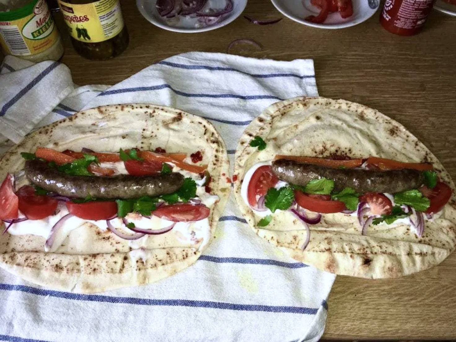 Wrapy z kiełbaską to moja bardzo luźna interpretacja kuchni północnej Afryki, w szczególności Tunezji. Bazą moich wrapów, rollerów, czy też może zawijańców (w sumie wszystkie te nazwy nie są zbyt frapujące) są bowiem kiełbaski merguez. Kiełbaski te pochodzą z Tunezji, ale chętnie jadane są w wielu krajach Afryki północnej. Wraz z imigrantami przywędrowały również do Europy (Francja). Kiełbaski merguez przyrządza się z baraniny lub jagnięciny, czasem z dodatkiem wołowiny. Są naprawdę solidnie przyprawione m.in. papryczką chilli lub ostrą pastą paprykową harissa, kminem rzymskim, cynamonem, czosnkiem. Kiełbaski merguez znakomicie smakują z grilla lub smażone i takie też zaserwuję tym razem.