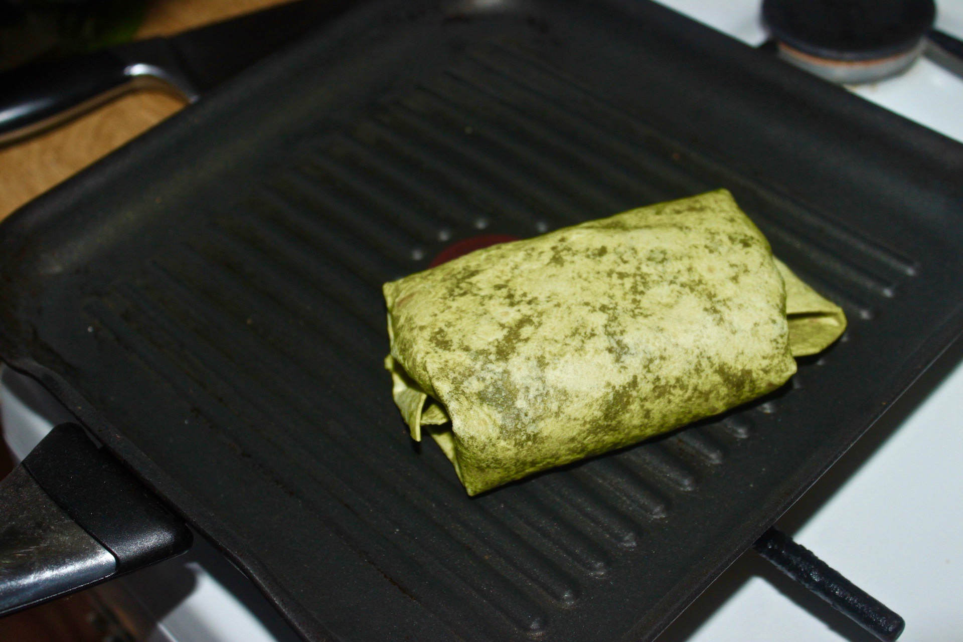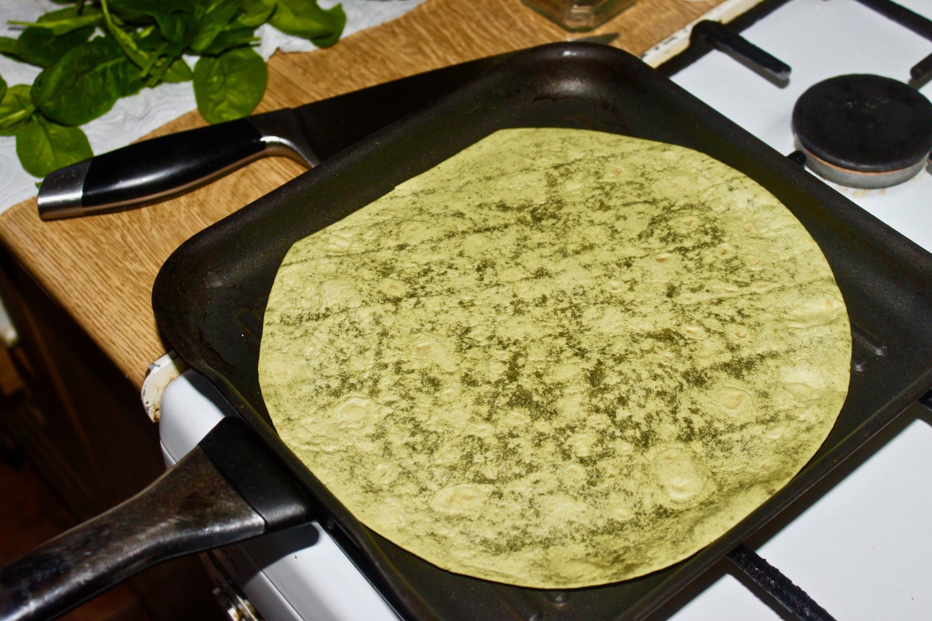 Podgrzej wrapy: Podgrzewaj każdą tortillę na suchej patelni przez około minutę, aby zmiękła. Zdejmij ją z patelni i połóż na blacie.
