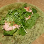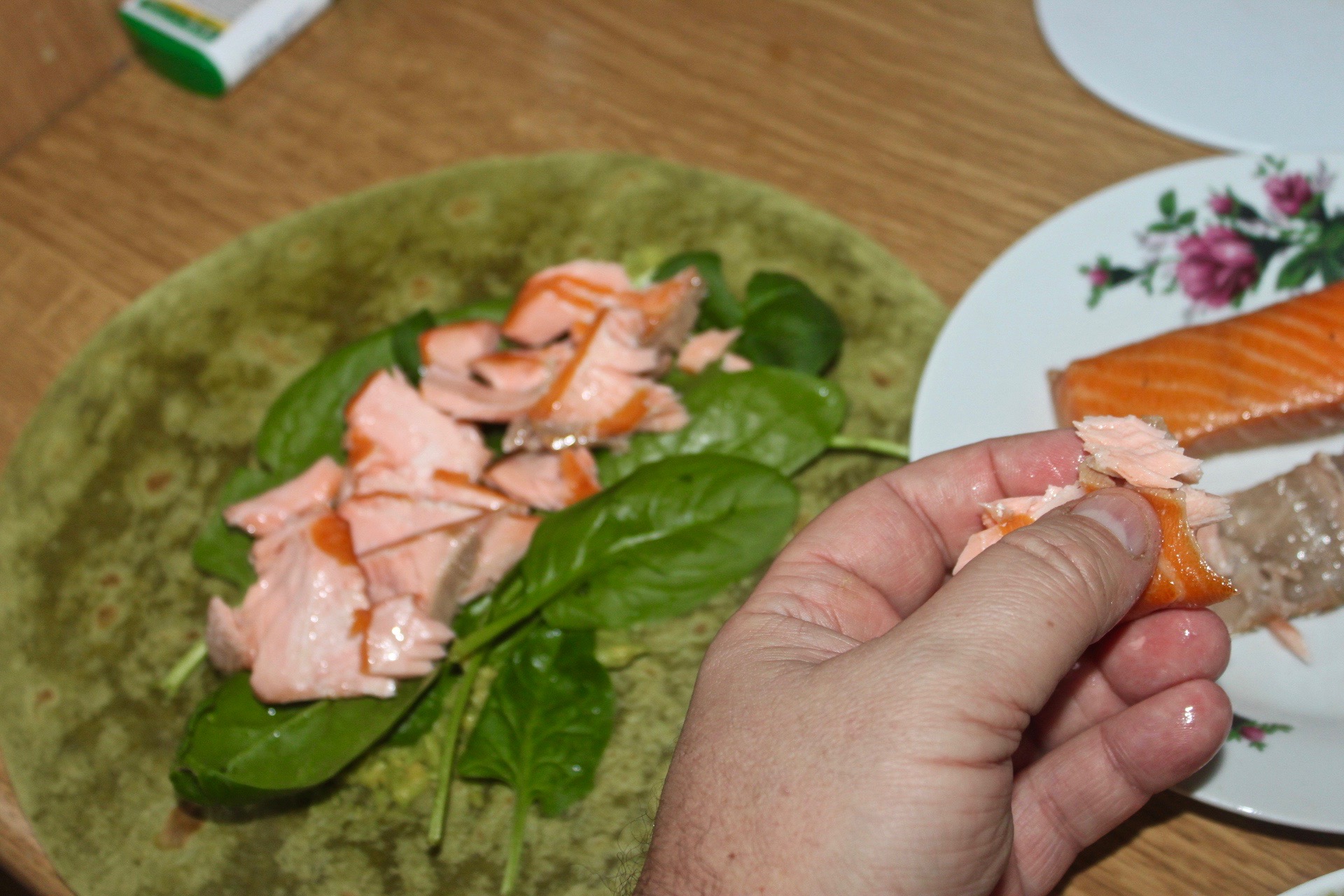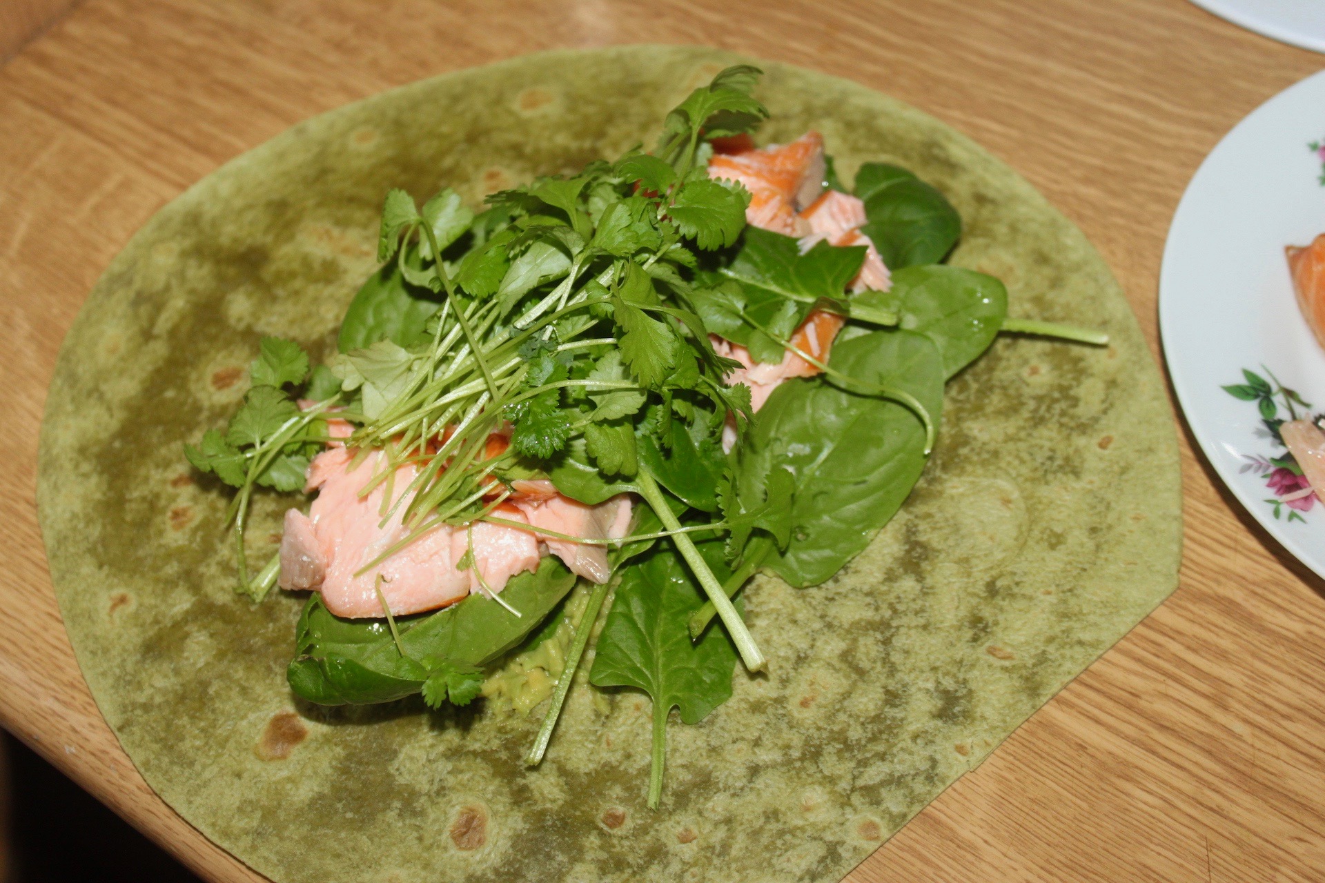 Nadziewaj wrapy: Posmaruj tortillę dość obficie przygotowaną pastą z awokado. Następnie rozłóż na niej liście szpinaku. Na szpinaku rozłóż wędzonego łososia, rozdrabniając go na mniejsze kawałki. Na koniec połóż garść świeżych liści kolendry.