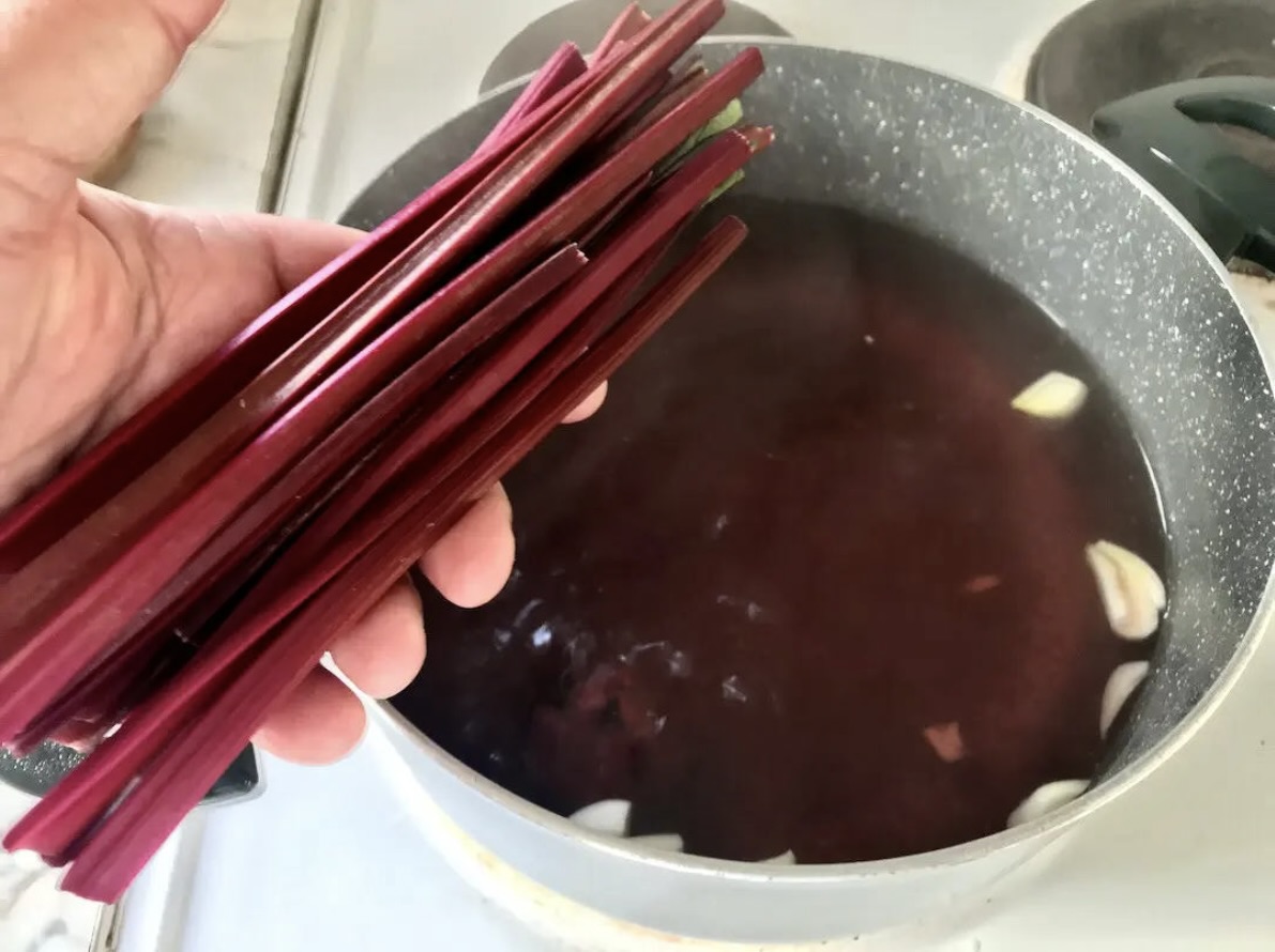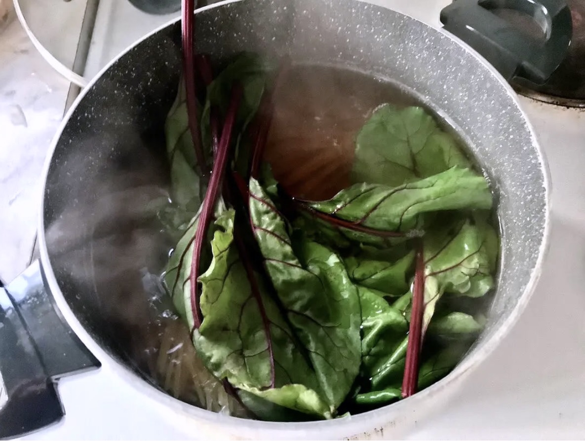 Następnie dorzuć łodygi naci buraka, a następnie gotuj całość kolejne 15 minut. Całkowity czas gotowania buraków zależy od ich wielkości.
