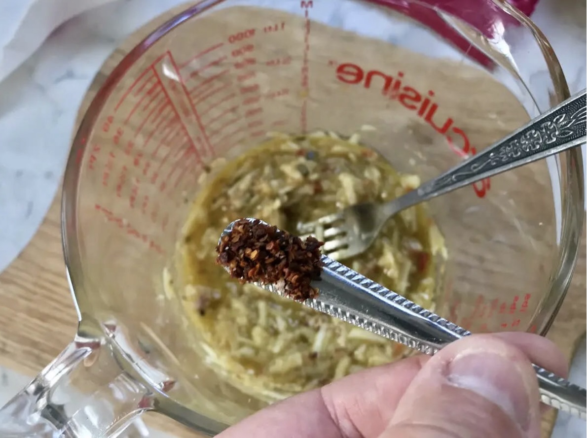 W misce zetrzyj garść sera (parmezanu lub owczego), wlej 3-4 łyżki oliwy extra vergine, dodaj sól i szczyptę suszonych płatków chili.