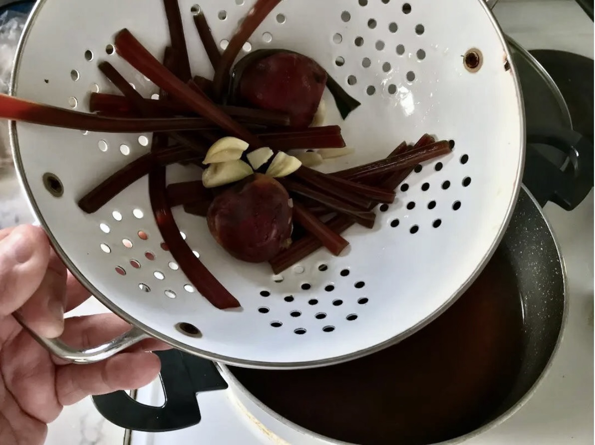 Wyjmij ugotowane buraki i łodygi na durszlak, aby ostygły i odciekły.