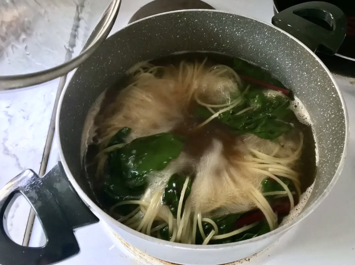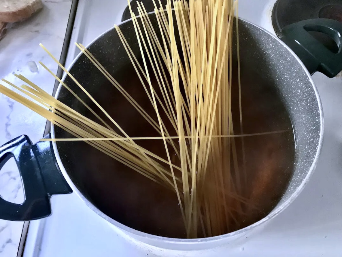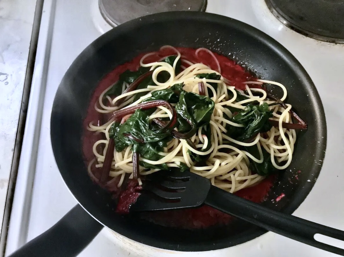 Do tej samej wody, w której gotowała się botwinka, wrzuć makaron spaghetti. Gotuj go przez 5 minut (jeśli zwykle gotujesz al dente 10 minut).
