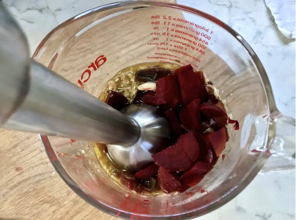 Miksuj blenderem ręcznym na gęste pesto. Gęstość reguluj oliwą, a smak serem, dążąc do zrównoważenia ziemistego smaku buraka ze smakiem sera.