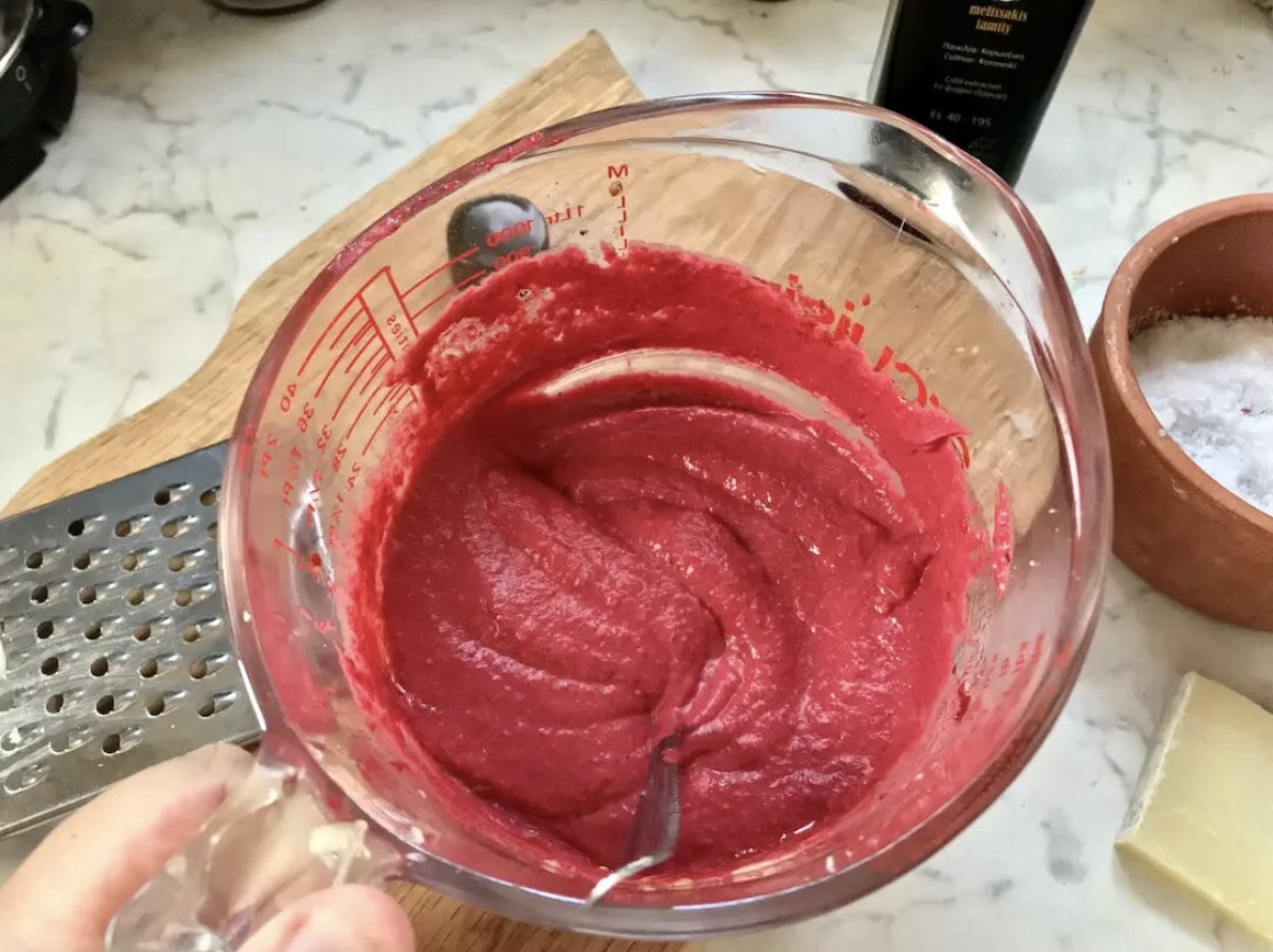 Dodaj 2-3 łyżki przygotowanego pesto z buraka.