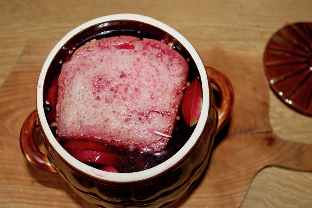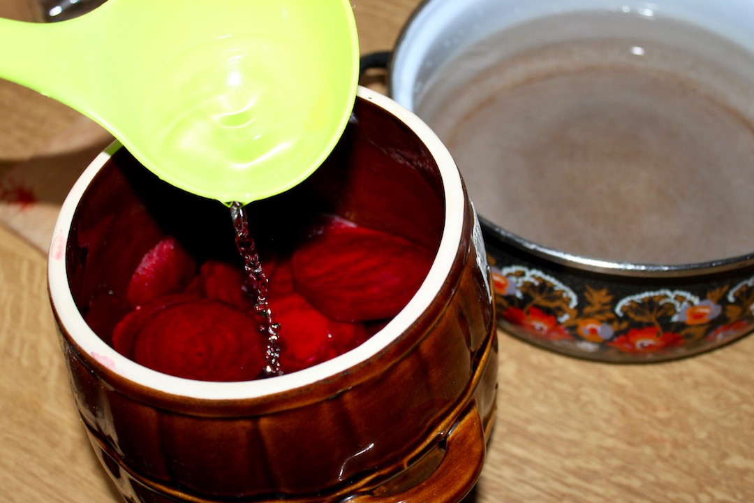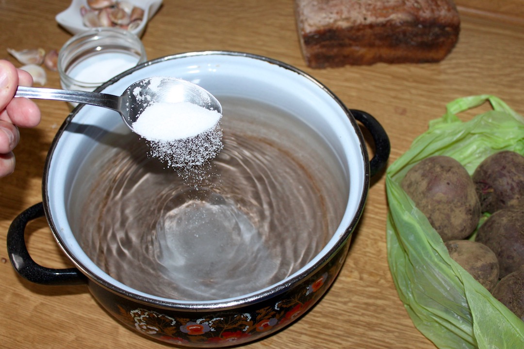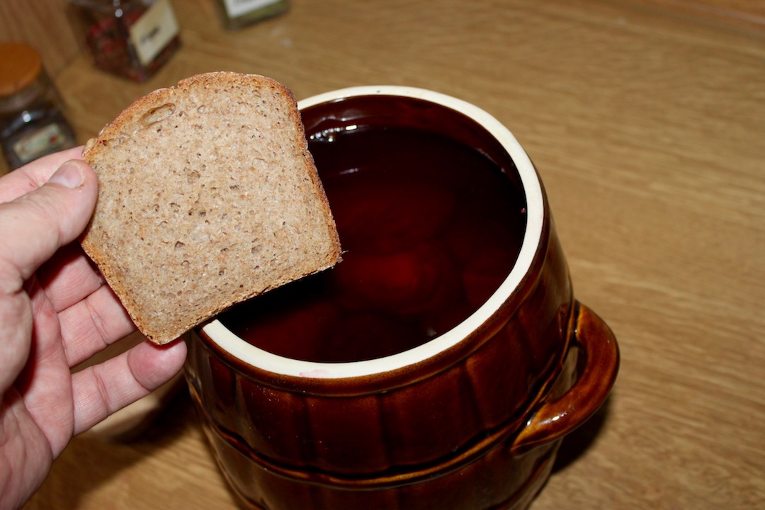 Po 2 dniach: Wyjmij kromkę chleba. Upewnij się, że buraki są dociskane i znajdują się pod wodą, aby zapobiec pleśnieniu. Ewentualny kożuszek na powierzchni usuwaj drewnianą łyżką.