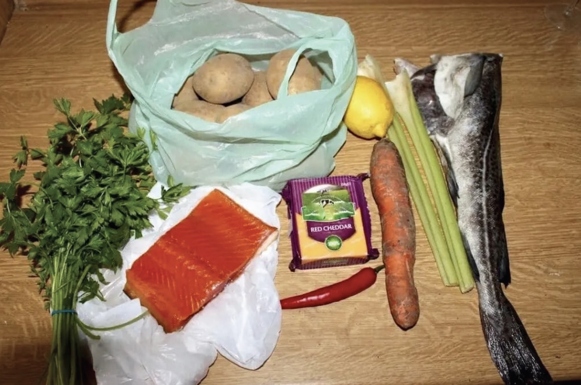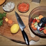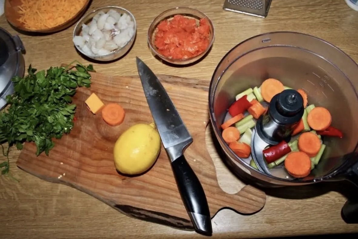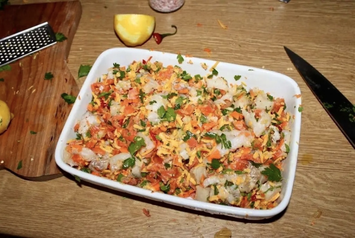Przygotowanie spodu i ryby: Łososia wędzonego posiekaj w nieduże kawałki, a dorsza pokrój w małą kostkę. Marchewkę, seler naciowy i papryczkę chilli zetrzyj w malakserze na małe kawałeczki (nie na miazgę).