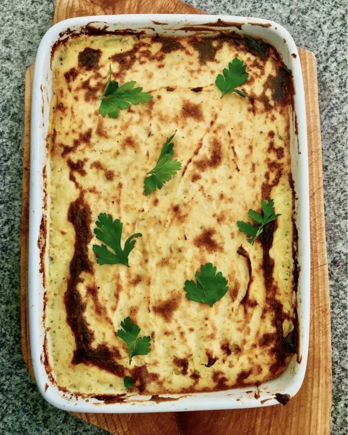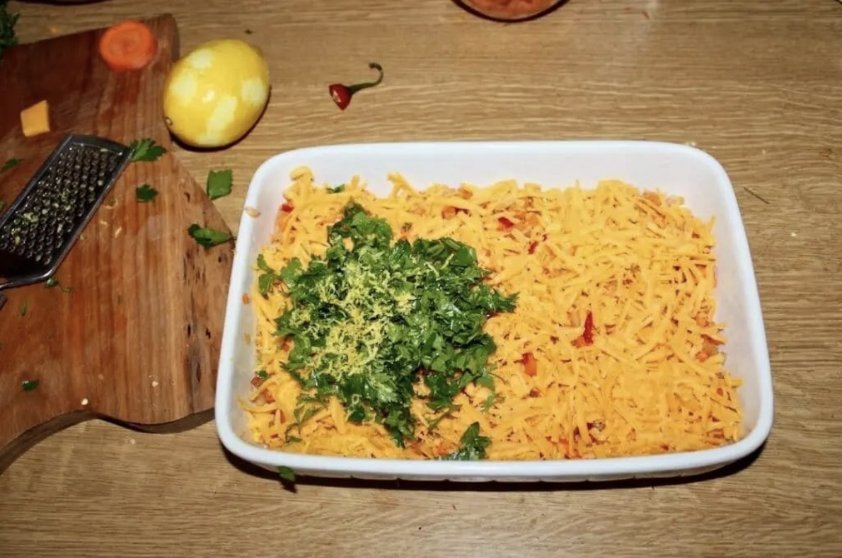 Wyjmij zapiekankę z piekarnika i daj jej odpocząć 2-3 minuty przed podaniem.