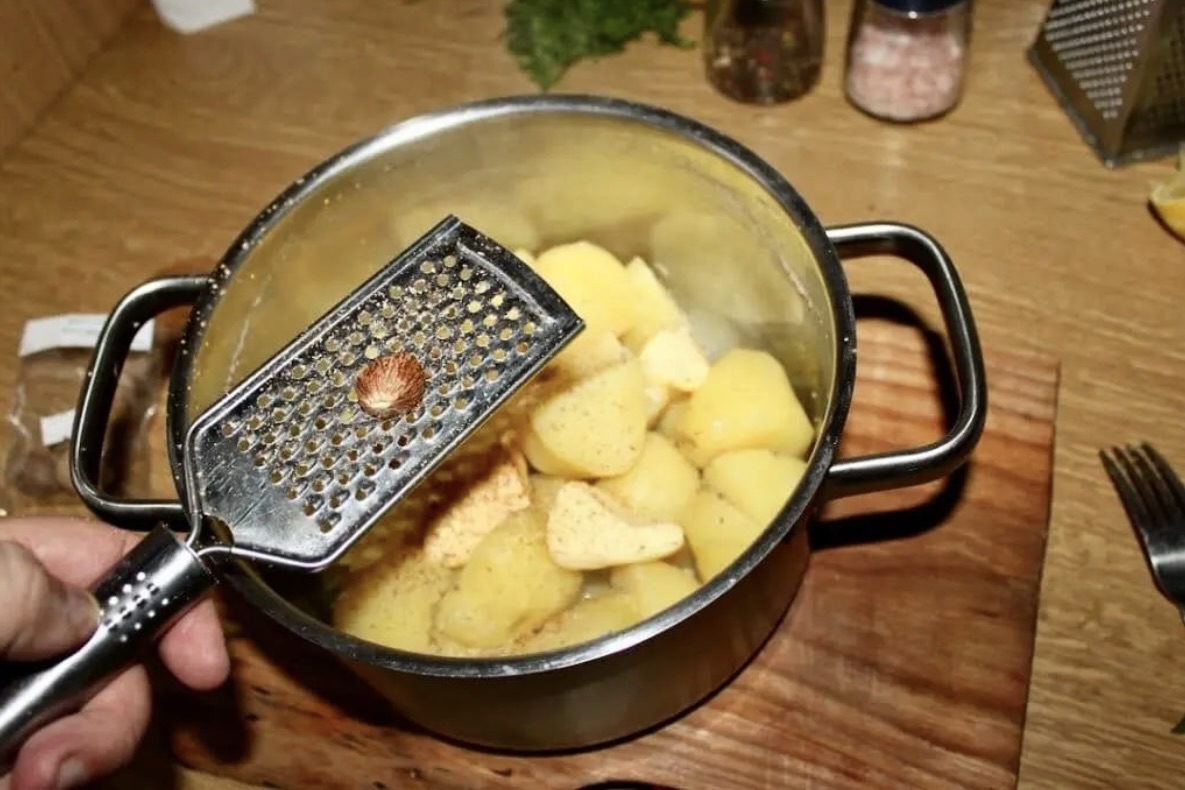 Przygotowanie puree: Ugotuj ziemniaki w osolonej wodzie, a następnie odcedź je. Dodaj masło i świeżo startą gałkę muszkatołową, sól oraz świeżo zmielony pieprz. Wlej do ziemniaków nieco mleka i porządnie ugnieć, aby puree stało się idealnie puszyste.