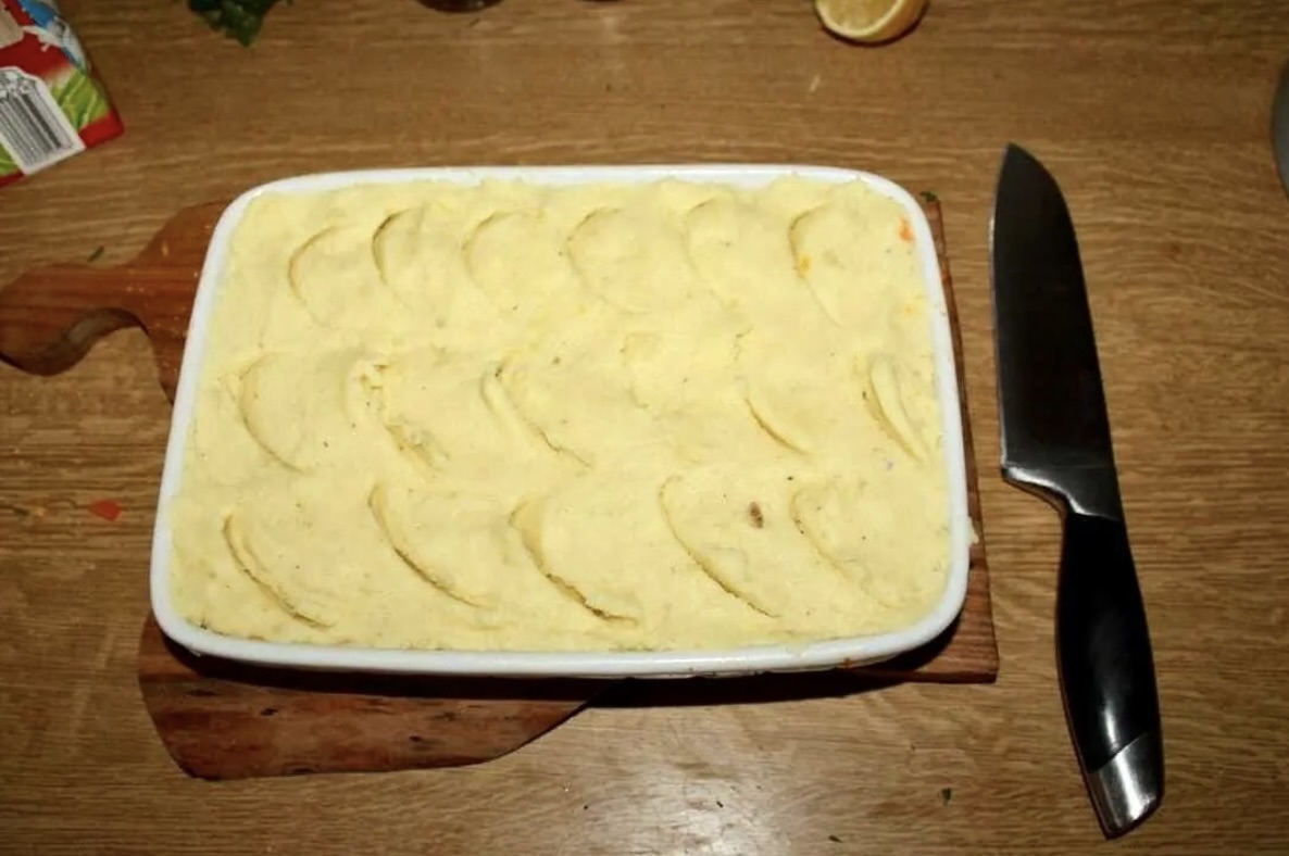 Tak przygotowane puree ziemniaczane rozłóż na wierzchu zapiekanki rybnej.