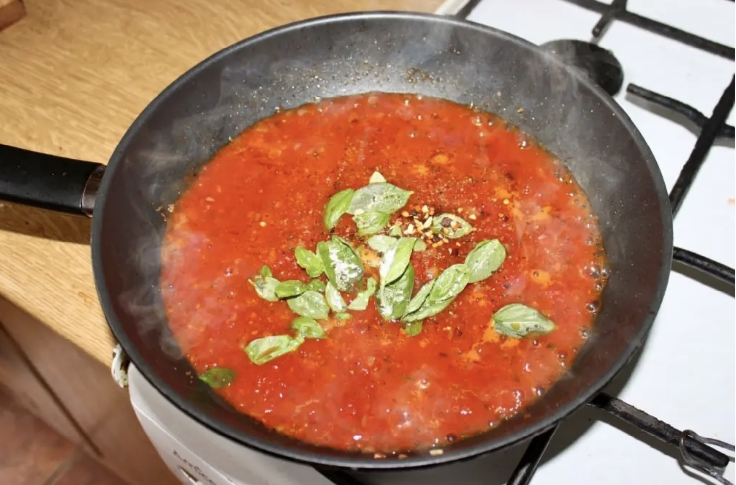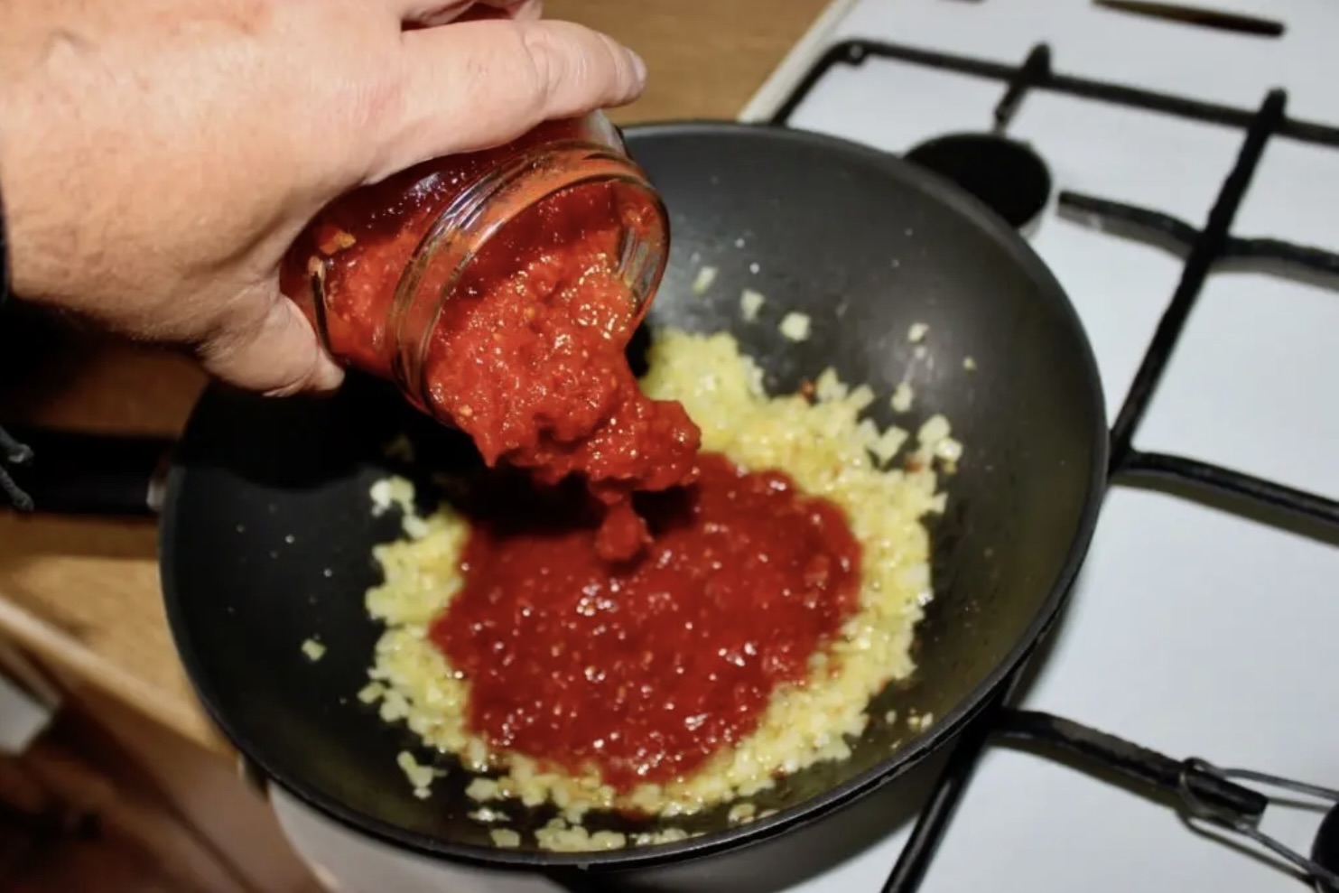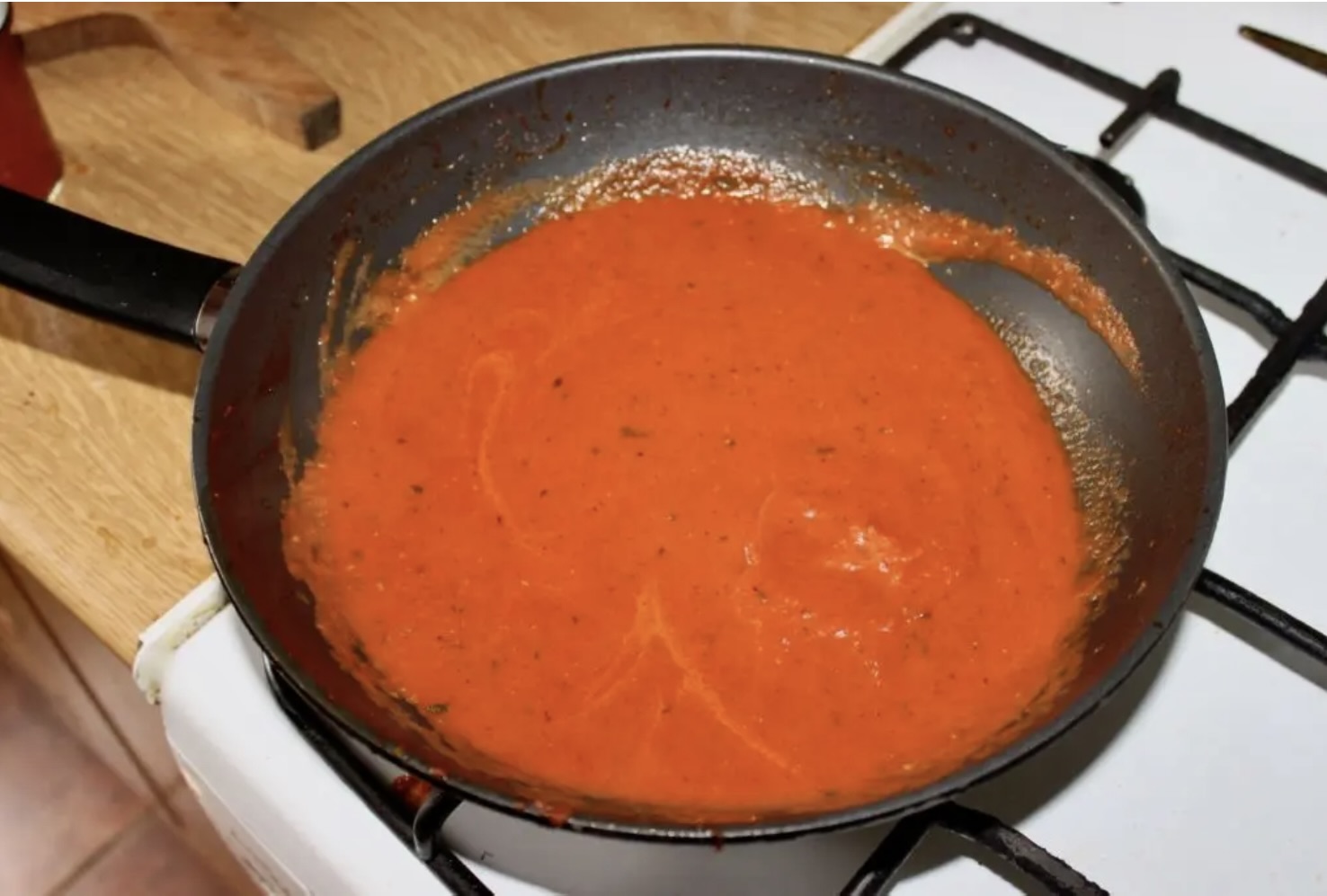 Wlej domowy sos pomidorowy lub passatę pomidorową.