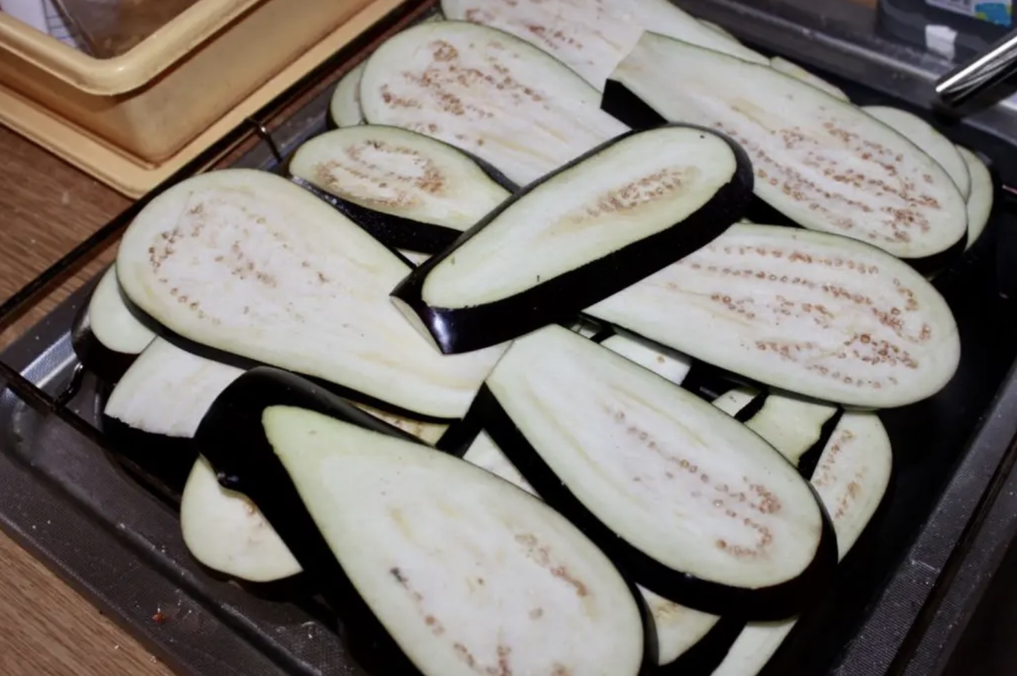Po 30 minutach przepłucz plastry bakłażana pod bieżącą wodą, a następnie dokładnie odsącz na ścierce.