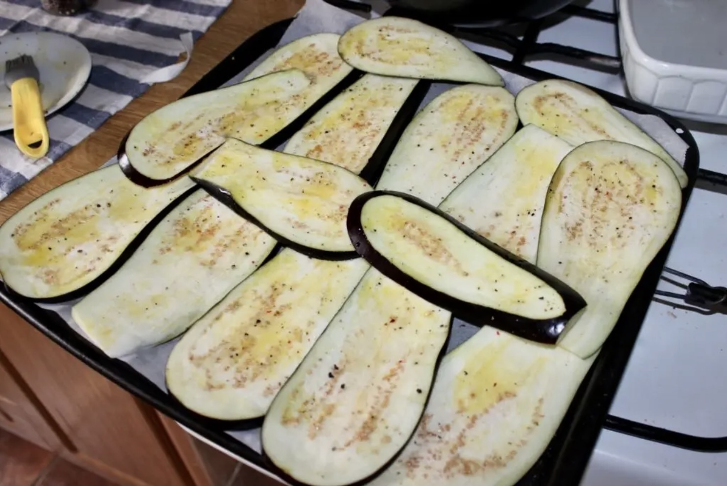 Na blasze z piekarnika wyłożonej papierem do pieczenia ułóż plastry bakłażana.