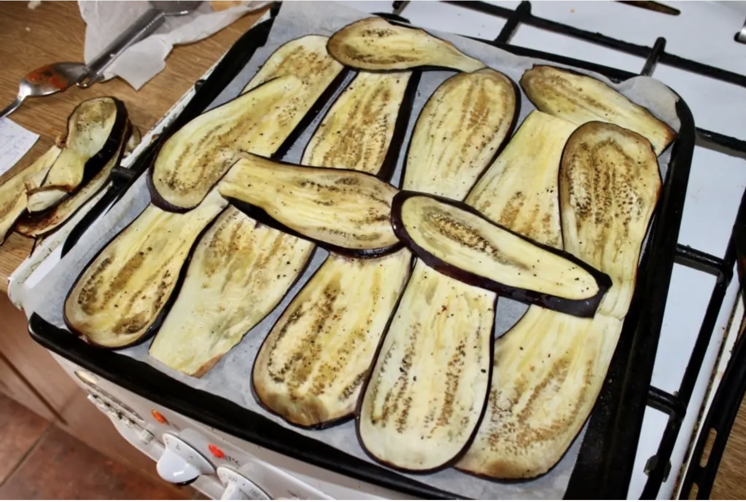 Ułóż plastry upieczonego bakłażana, tak aby ściśle pokryły całe dno.