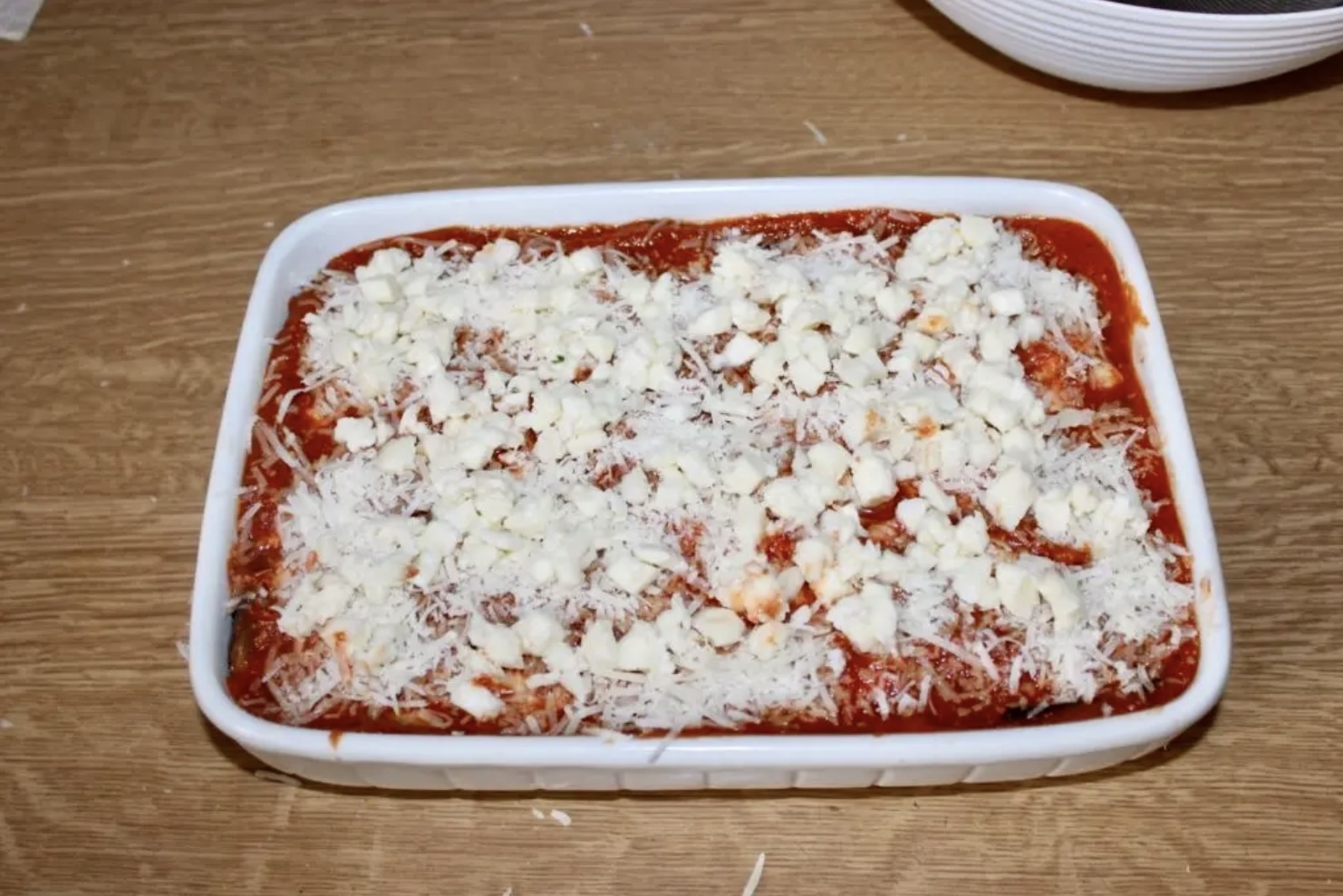 Na wierzchu zapiekanki powinien znaleźć się sos pomidorowy, starty Grana Padano i mozzarella. Ważne: Używaj sosu pomidorowego oszczędnie, aby zapiekanka po upieczeniu się nie „rozjechała”.