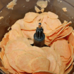 Bataty: Obierz bataty i pokrój je na cienkie talarki (można użyć malaksera). W tej samej wodzie, w której gotowała się kapusta, gotuj talarki batatów przez 3 minuty. Odsącz je na ściereczce.
