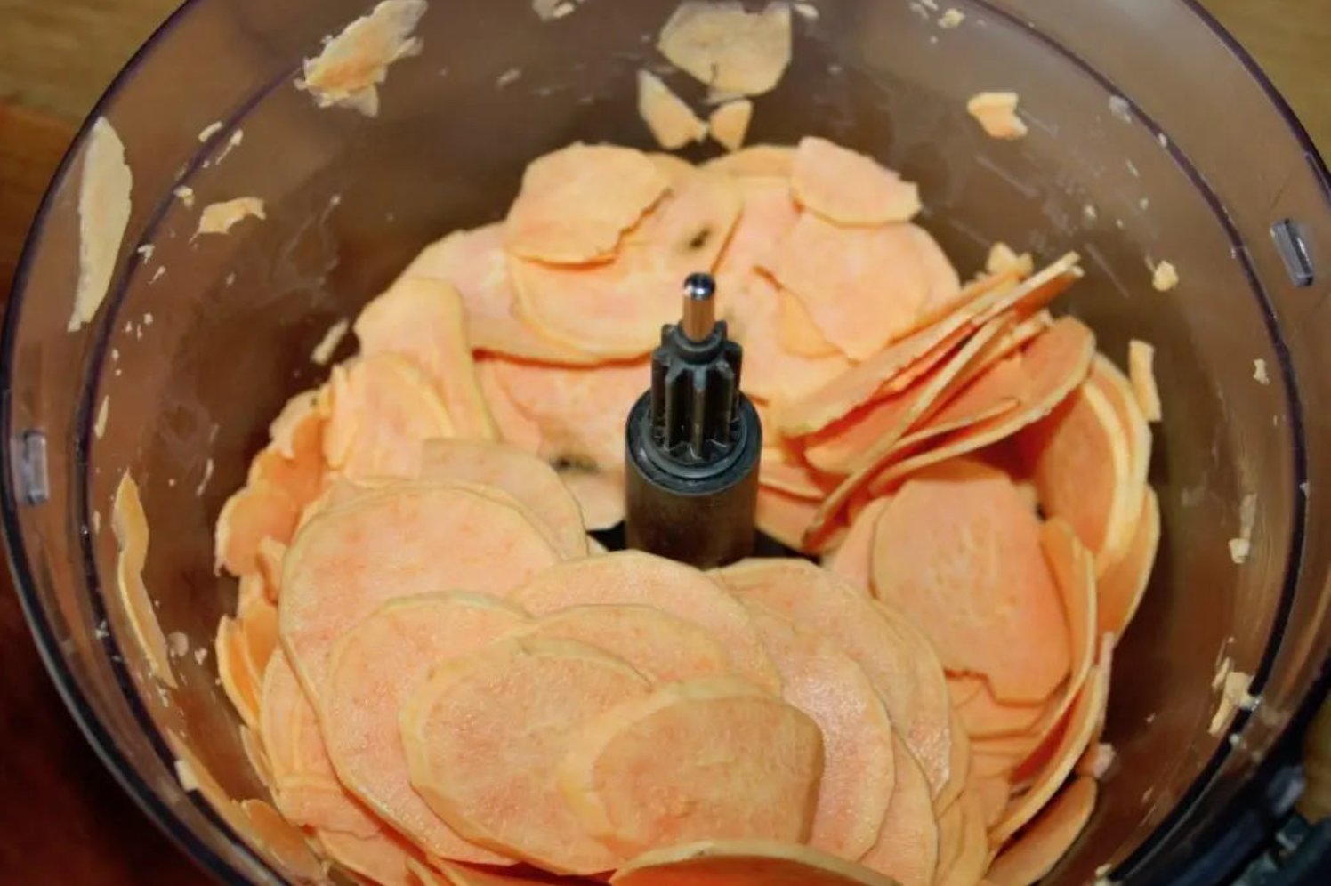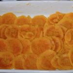 Bataty: Obierz bataty i pokrój je na cienkie talarki (można użyć malaksera). W tej samej wodzie, w której gotowała się kapusta, gotuj talarki batatów przez 3 minuty. Odsącz je na ściereczce.
