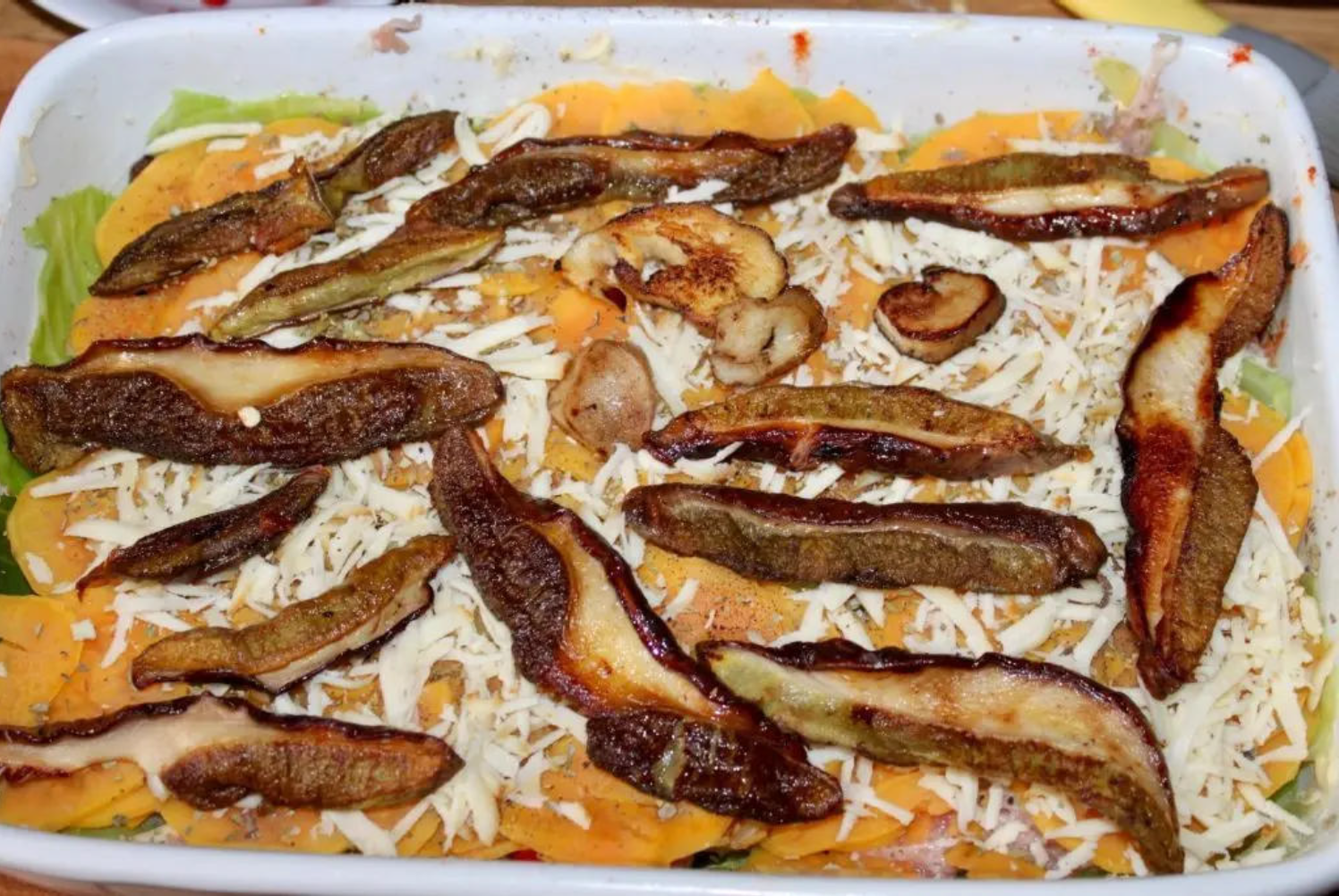 Moja zapiekanka z grzybami jest naprawdę pyszna. W naczyniu żaroodpornym należy układać kolejno warstwy kapusty, batatów, mięsa z surowej białej kiełbasy oraz świeżych grzybów, a całość doprawia swym smakiem starty oscypek. Po zapieczeniu trudno opanować się przed dobraniem dokładki. Zapiekanka z grzybami to świetne danie na podsumowanie sezonu grzybowego. Bataty, kiełbasa, grzyby, to musi smakować dobrze. I smakuje.