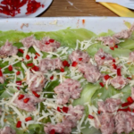 Wierzch: Na koniec rozłóż na wierzchu kilka talarków batatów, kilka kawałków liści kapusty, posyp startym oscypkiem, a następnie nałóż kilka kawałków masła.