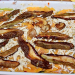 Druga warstwa: Ułóż drugą, identyczną warstwę, zaczynając ponownie od talarków batatów, grzybów, sera i przypraw.