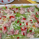 Na liście nałóż połowę mięsa z kiełbasy, posyp połową chilli, oregano i pieprzem.