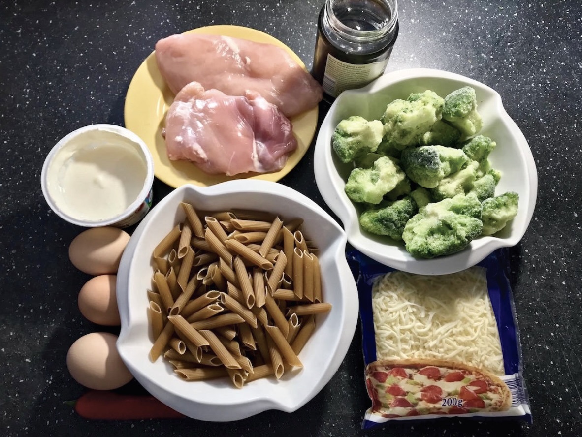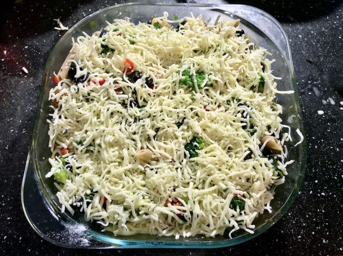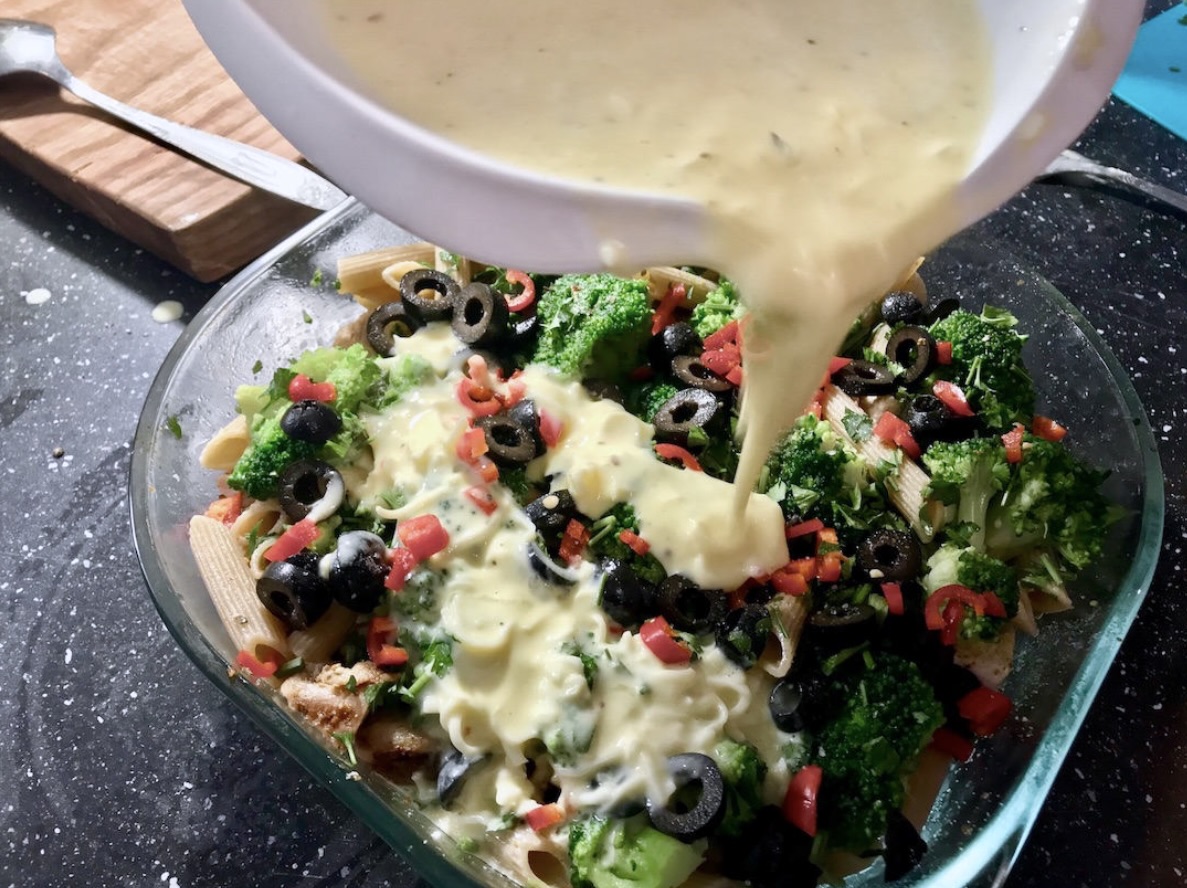 Składanie zapiekanki: Rozłóż pokrojonego kurczaka i różyczki brokuła na makaronie. Posyp pokrojonymi oliwkami, chili oraz posiekaną natką pietruszki. Możesz delikatnie przemieszać wszystkie składniki. Wlej do naczynia wcześniej przygotowaną masę jajeczną, delikatnie potrząsając naczyniem, aby masa dostała się pomiędzy składniki.
