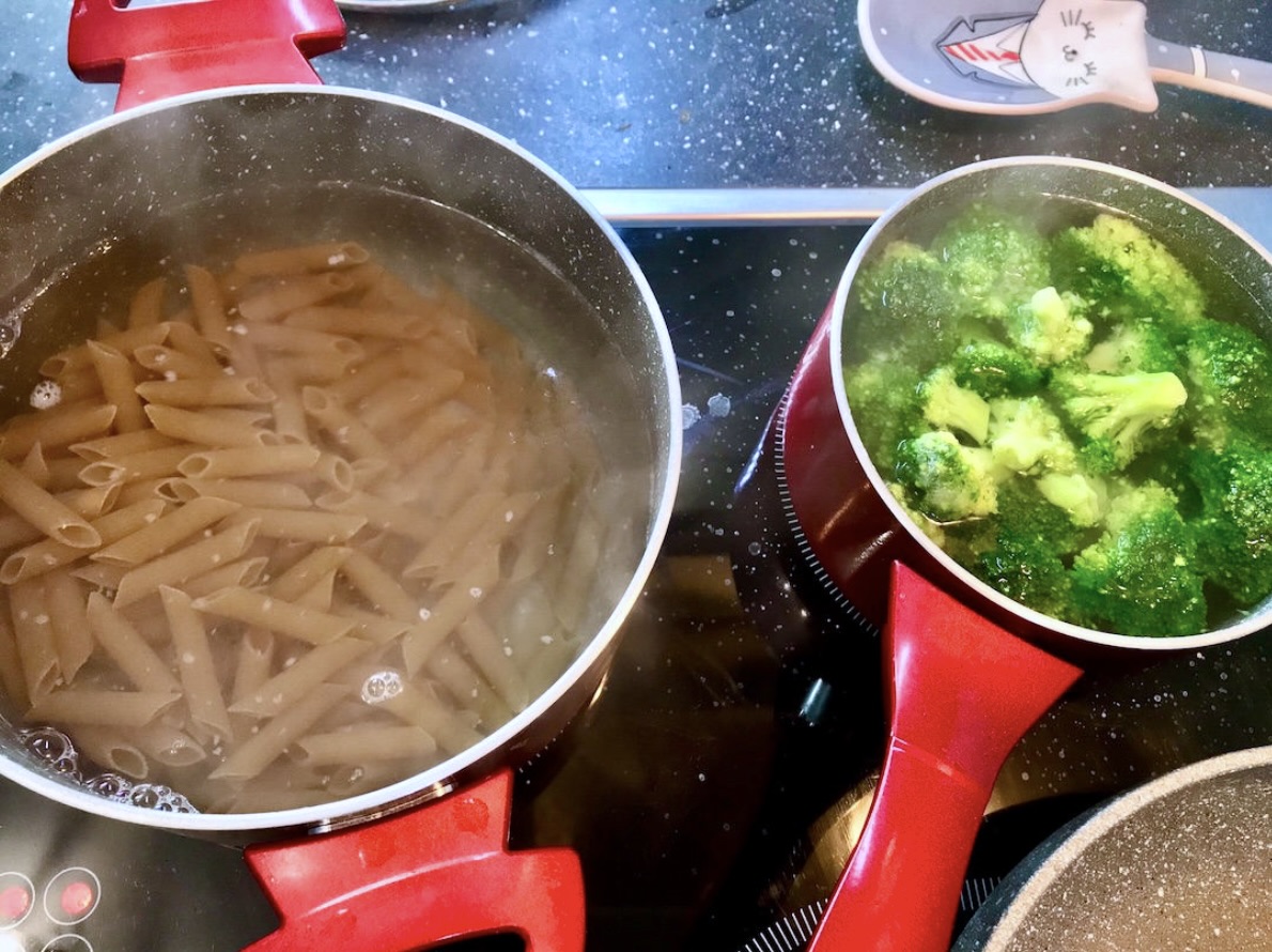 Makaron i brokuł: Ugotuj makaron „al dente” zgodnie z instrukcją na opakowaniu. Mrożone różyczki brokuła gotuj 3 minuty od momentu zagotowania wody po ich wrzuceniu. Odcedź makaron i brokuła. Makaron przełóż do nasmarowanego oliwą naczynia żaroodpornego.
