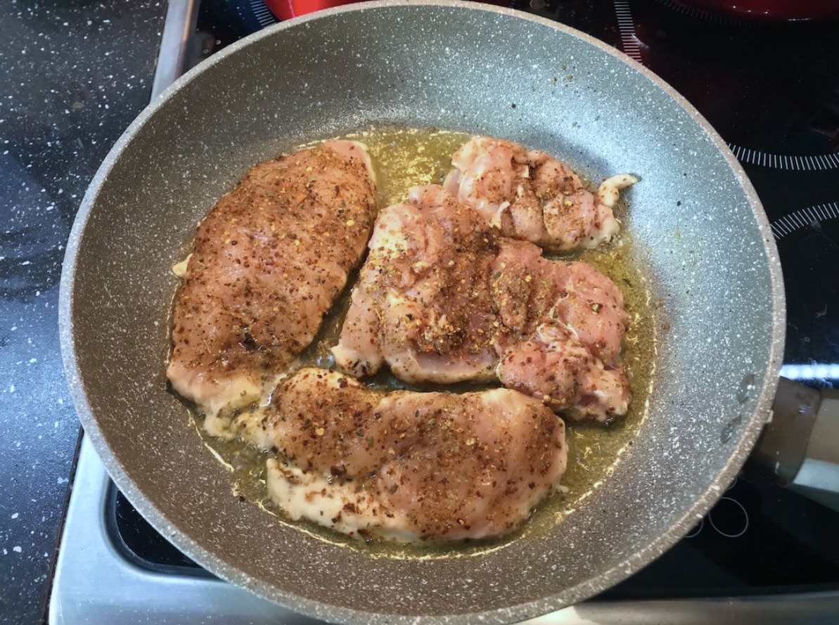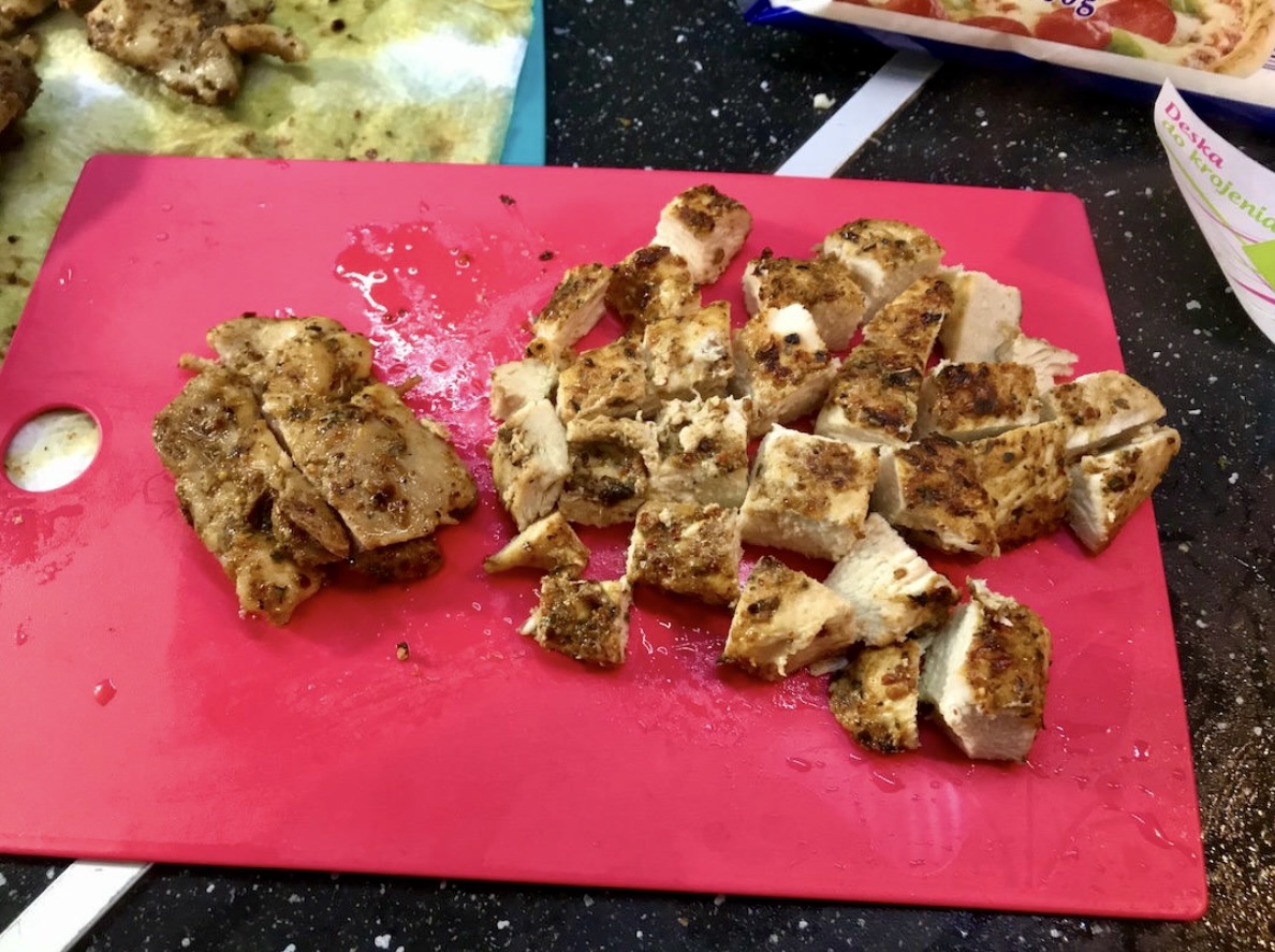 Mięso: Pierś z kurczaka przetnij wzdłuż na połowę, aby lepiej się usmażyło. Posól kurczaka i posyp obficie ulubioną przyprawą do drobiu. Smaż mięso na oliwie. Usmażonego kurczaka odsącz z nadmiaru tłuszczu na ręcznikach papierowych, a następnie pokrój w niedużą kostkę. Pamiętaj, aby kurczak pozostał soczysty w środku, ponieważ dojdzie podczas pieczenia.