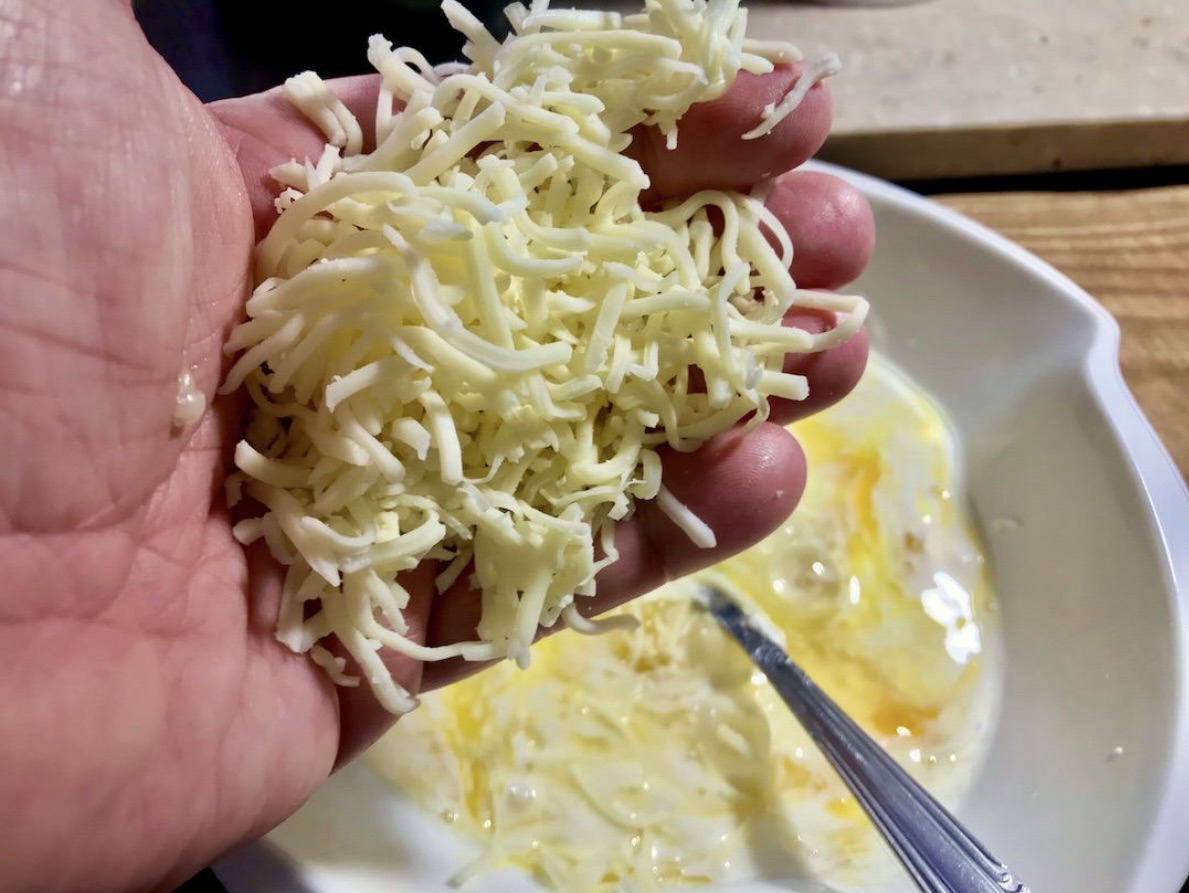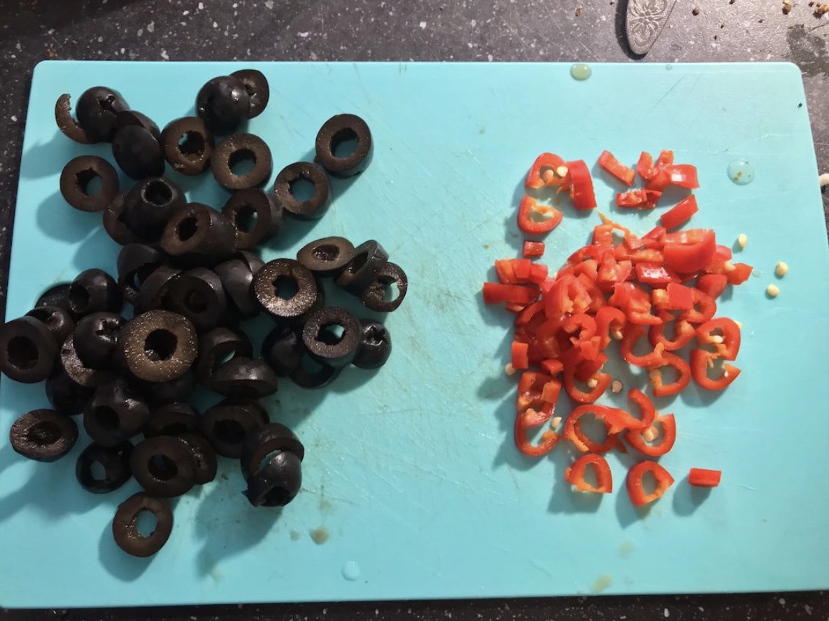 Dodatki i masa jajeczna: Pokrój na kawałki oliwki i posiekaj chili. W misce wbij jajka i dodaj śmietanę. Do jajek i śmietany dodaj startą mozzarellę (około 1/3 całej przygotowanej ilości). Wymieszaj masę, dodaj sól i świeżo zmielony pieprz.