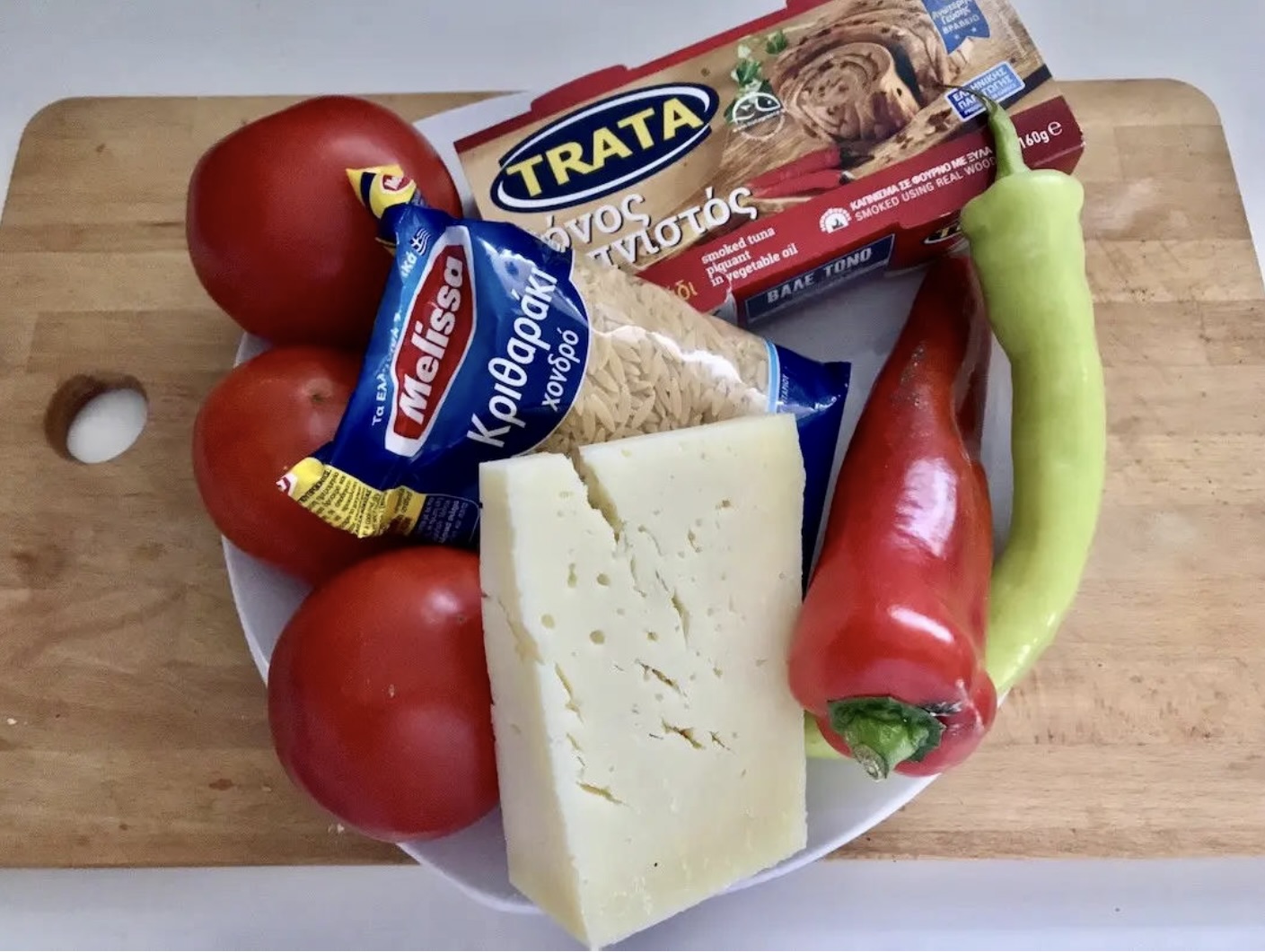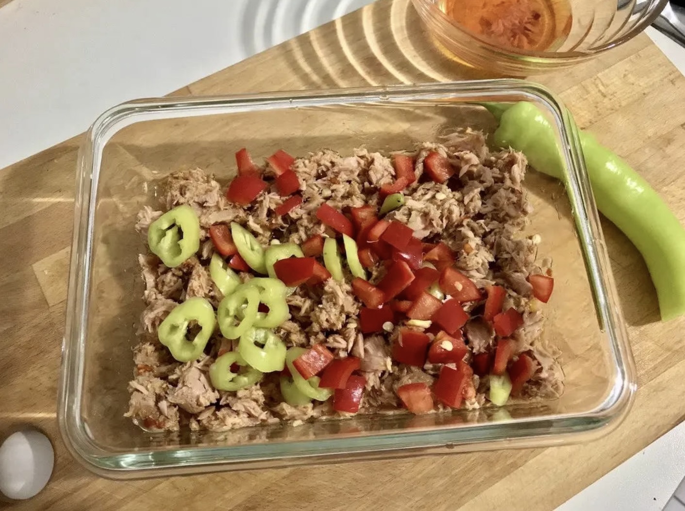 Przygotowanie tuńczyka i warzyw: Tuńczyka wyjmij z puszek i przełóż do żaroodpornego naczynia. Dodaj odrobinę oliwy z puszki. Papryki pokrój w cienkie plasterki i dodaj do tuńczyka. Następnie dodaj pokrojone drobno pomidory.