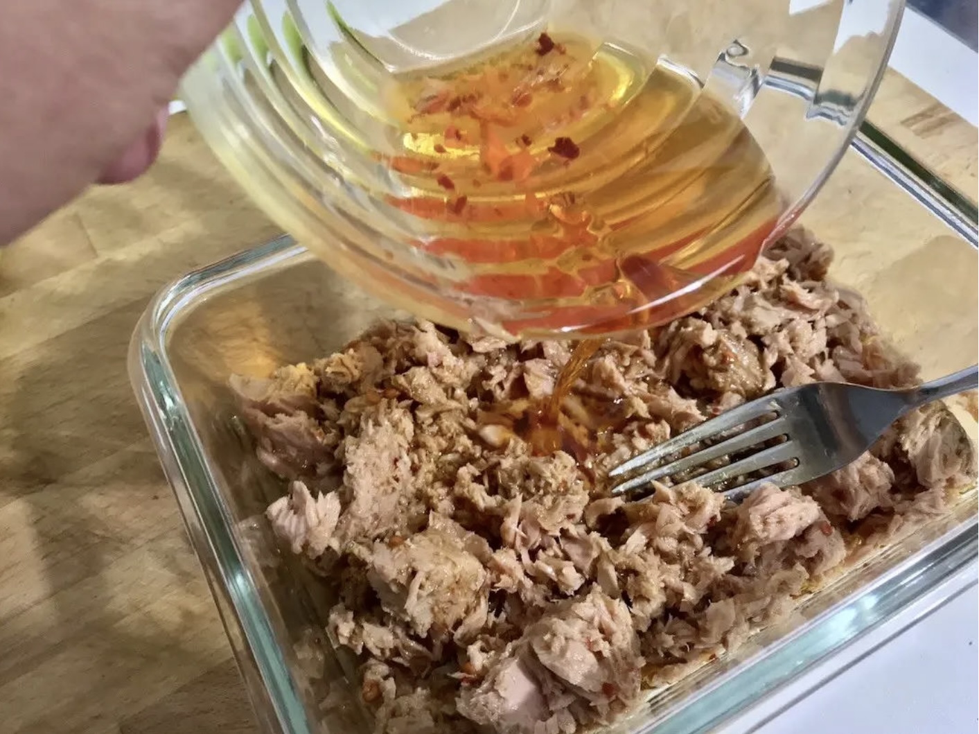 dwie puszki tuńczyka w oliwie na ostro (razem około 210 gramów netto)