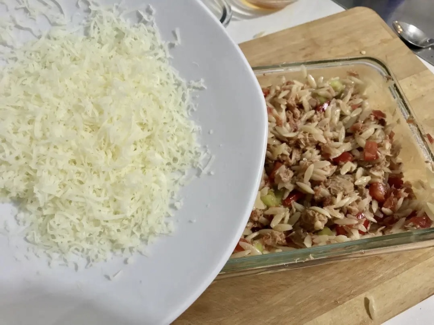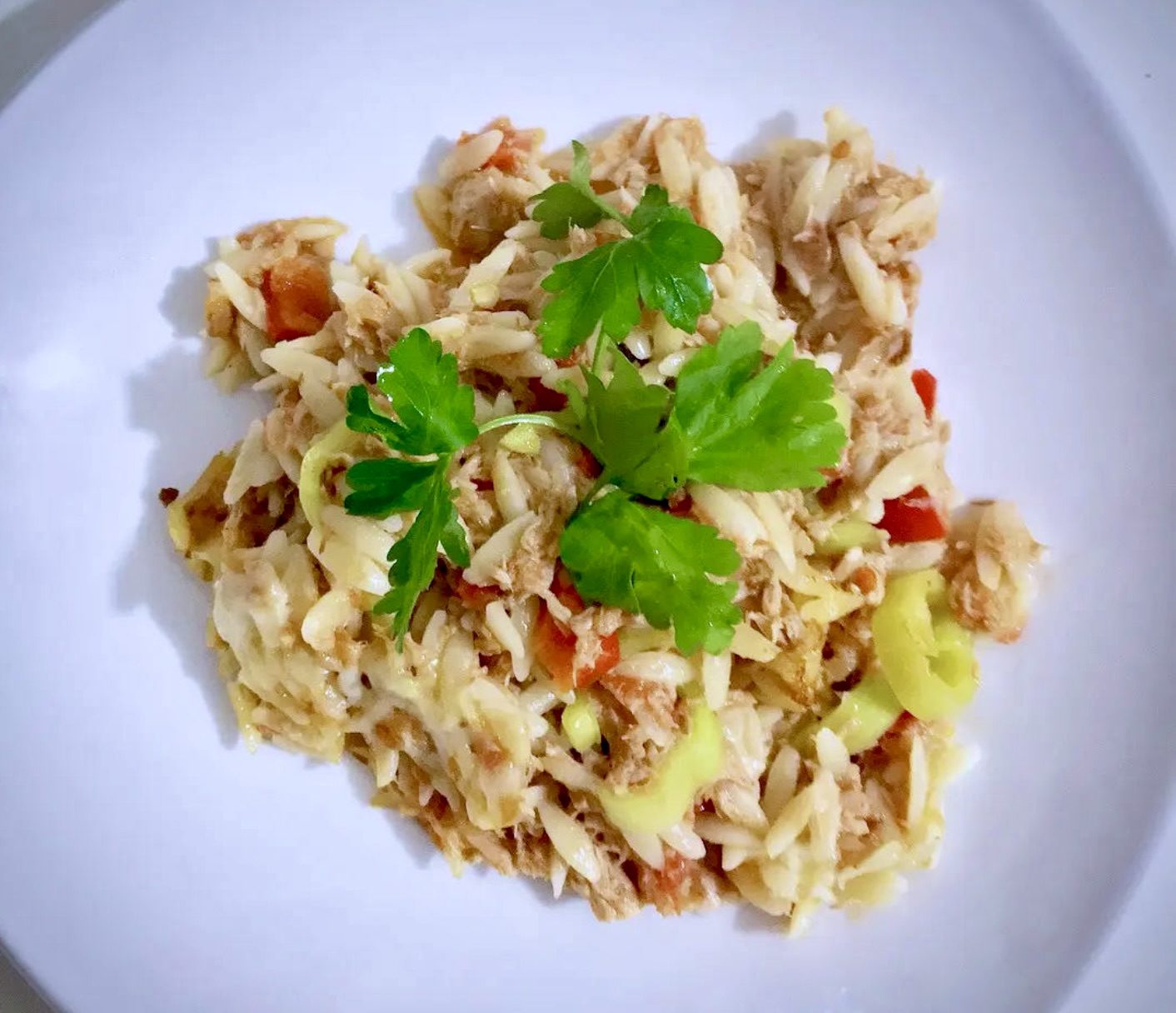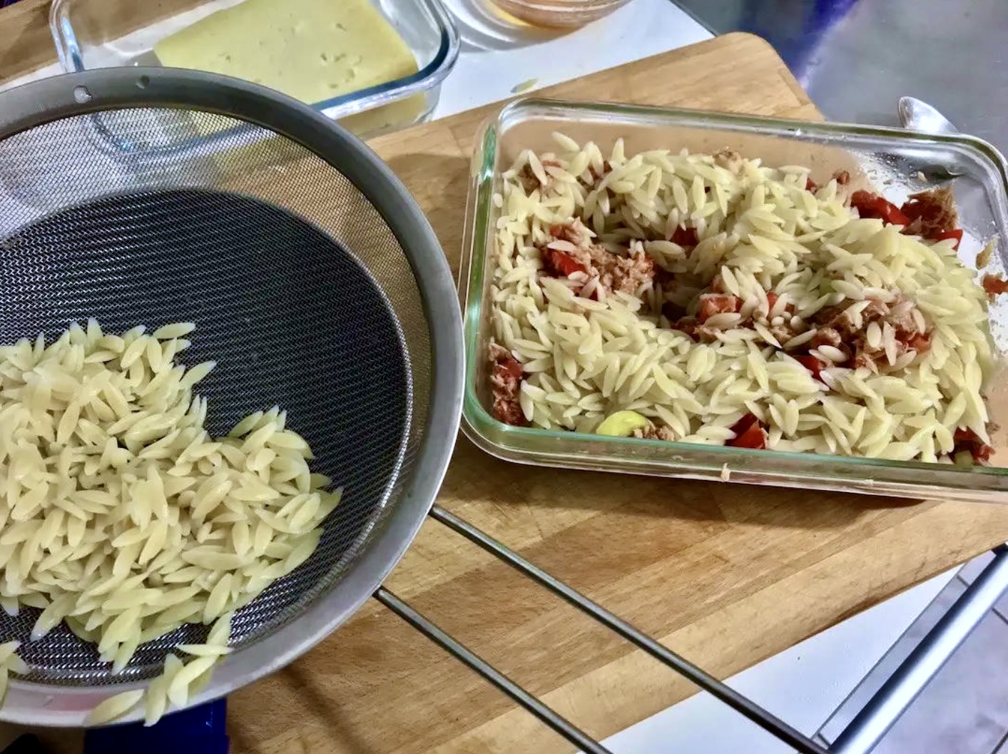 Makaron: Ugotuj makaron typu orzo al dente. Odcedź go, a następnie przełóż do naczynia z tuńczykiem i warzywami. Całość zamieszaj.