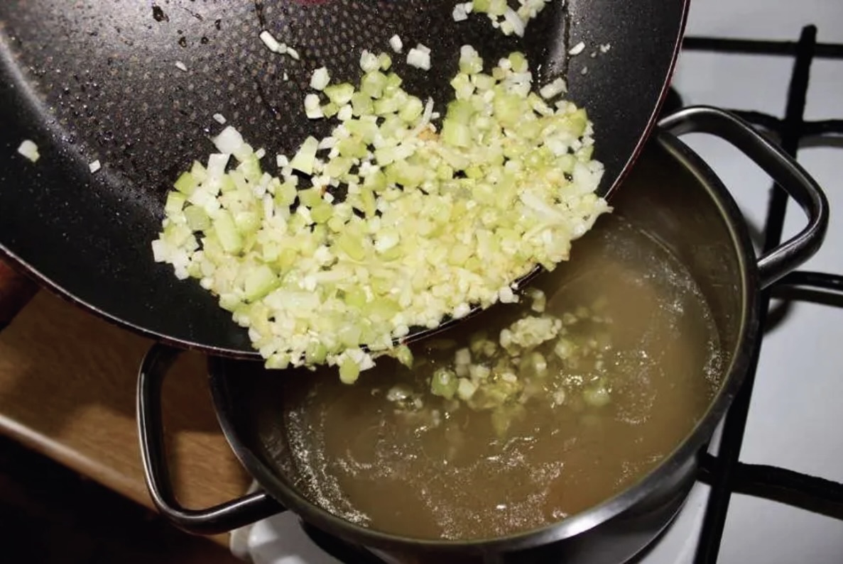 Gotowanie bazy: W garnku zagrzej wywar, dodaj podsmażone warzywa.