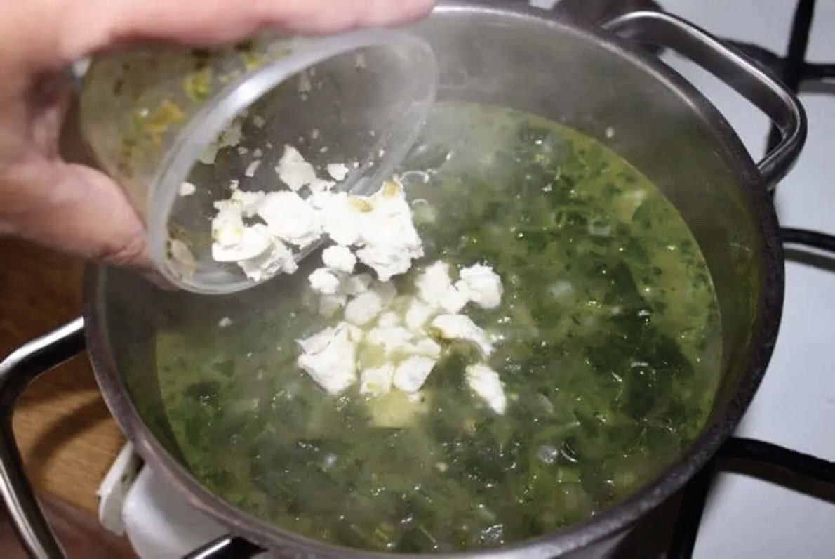 Doprawianie: Dodaj zielone pesto oraz ok. 50 g sera feta. Ser rozpuści się w gorącej zupie, nadając jej kremową konsystencję i słony posmak. Dopraw solą i pieprzem do smaku.