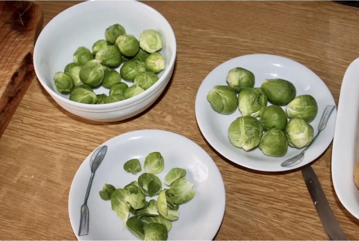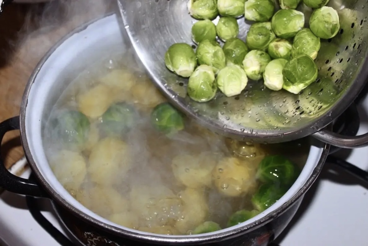 Brukselka: Oczyść z zewnętrznych liści, odetnij twarde końcówki i natnij je na krzyż (lub przekrój większe sztuki na pół). Gotuj we wrzątku przez ok. 5–7 minut, a następnie przelej zimną wodą (zachowa ładny kolor).