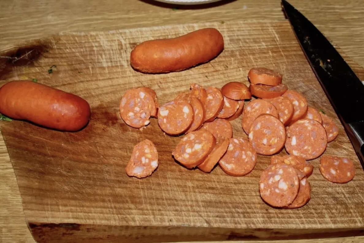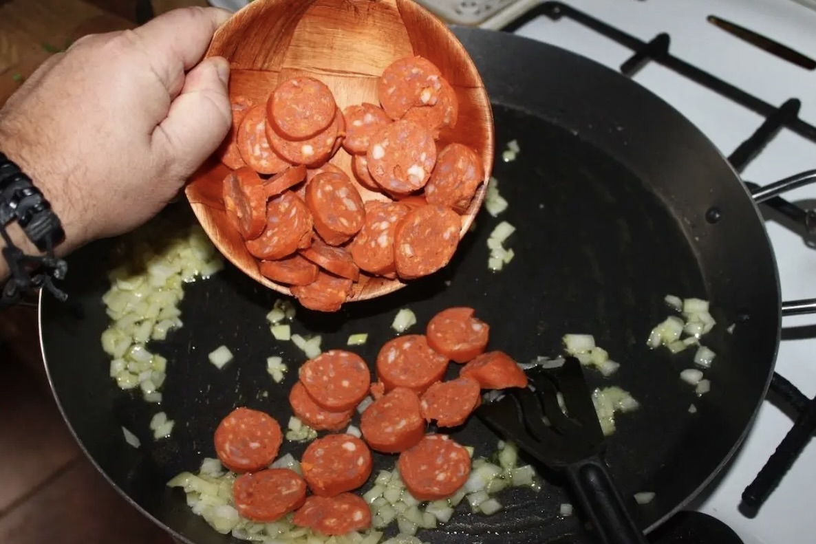 Kiełbasę pokrój w plasterki lub półplasterki. Podsmaż na patelni z odrobiną tłuszczu, aż się zrumieni (zobacz także jak smakuje kiełbasa duszona z papryką).