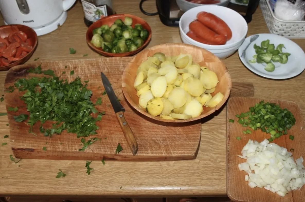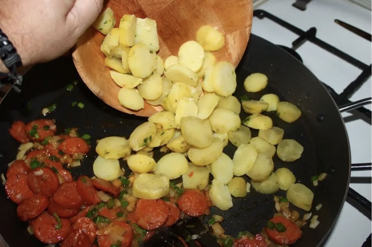 Jest to proste, jednogarnkowe danie (typu „chłopski garnek”), w którym kluczowe jest wcześniejsze podgotowanie twardszych składników, aby na patelni jedynie nabrały chrupkości.