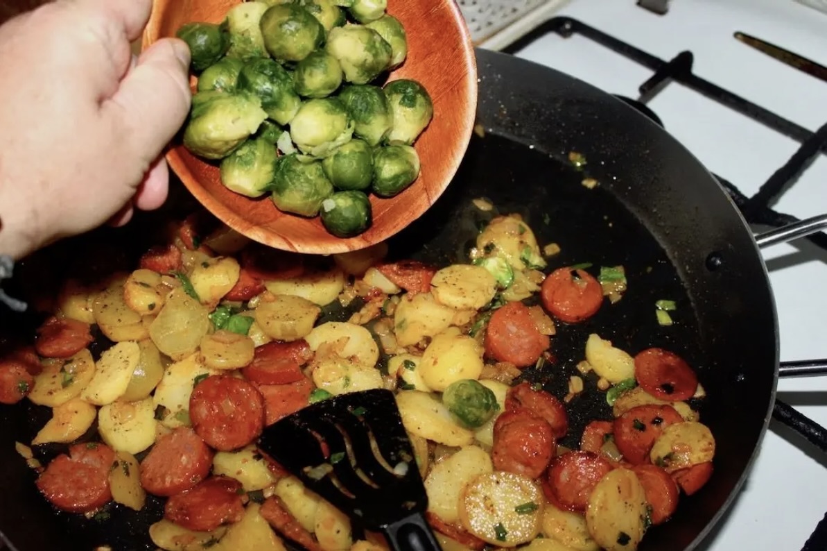 Smaż na średnim ogniu przez kolejne 10–15 minut, często mieszając, aż ziemniaki i brukselka ładnie się przypieką i staną się złociste.
