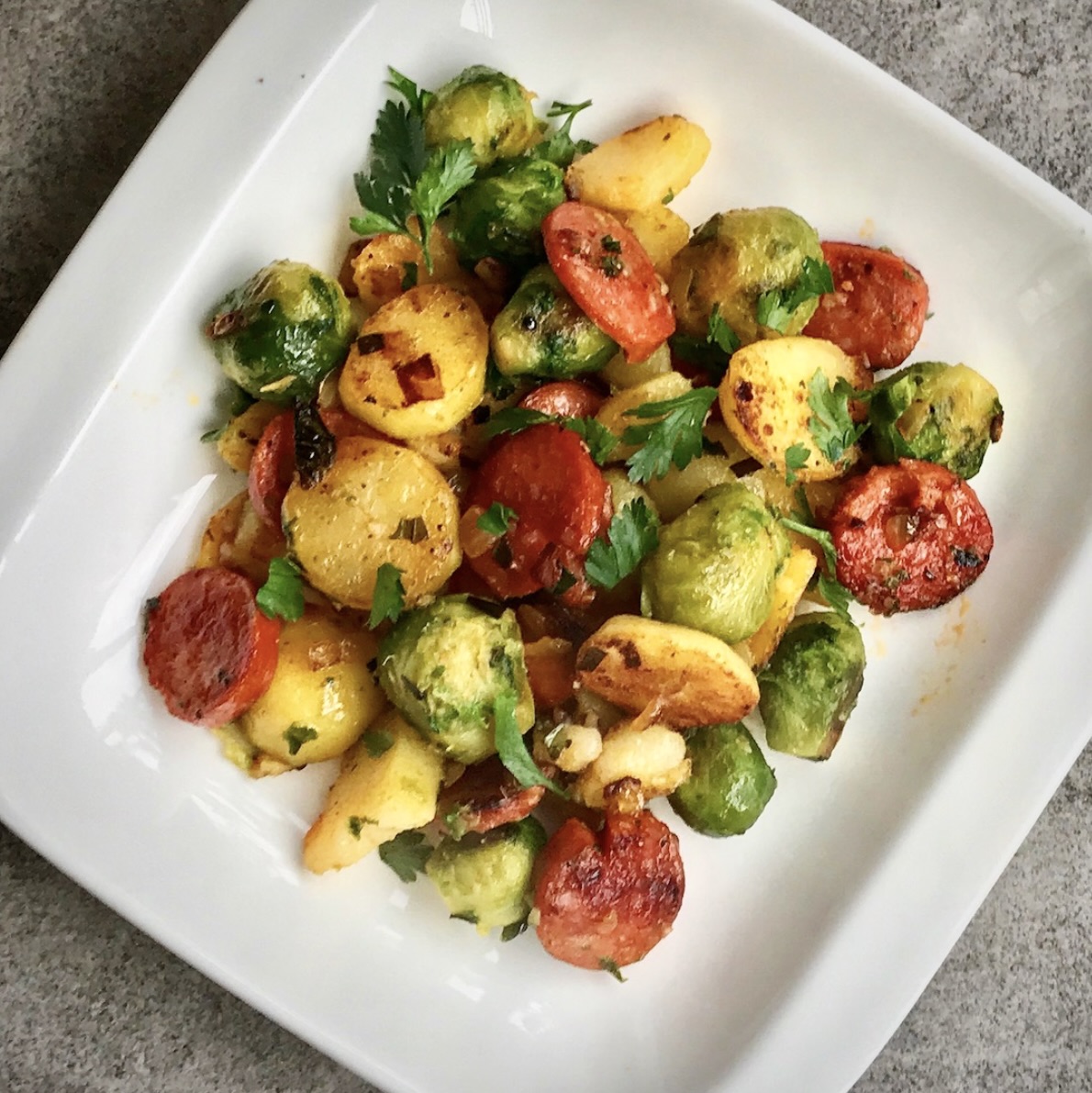 Ziemniaki smażone z kiełbasą to odmiana popularnych w wielu rejonach Polski bratkartofli. Pozostałe z poprzedniego dnia ziemniaki kroi się na kawałki lub plastry, a następnie smaży na tłuszczu tak, aby w środku pozostały miękkie, z wierzchu zaś stały się chrupiące. Chrupiące, bo po prostu solidnie przysmażone. Znam i takich smakoszy, co to bratkartofle muszą mieć wręcz lekko przypalone, aby lepiej smakowały. Moje ziemniaki smażone nie są ortodoksyjną wersją bratkartofli. Jak przystało na przyzwoicie zbilansowany posiłek jako warzywo główne wskoczyły do dania brukselki. Całość smakuje fenomenalnie.
