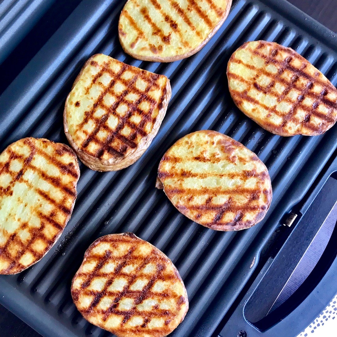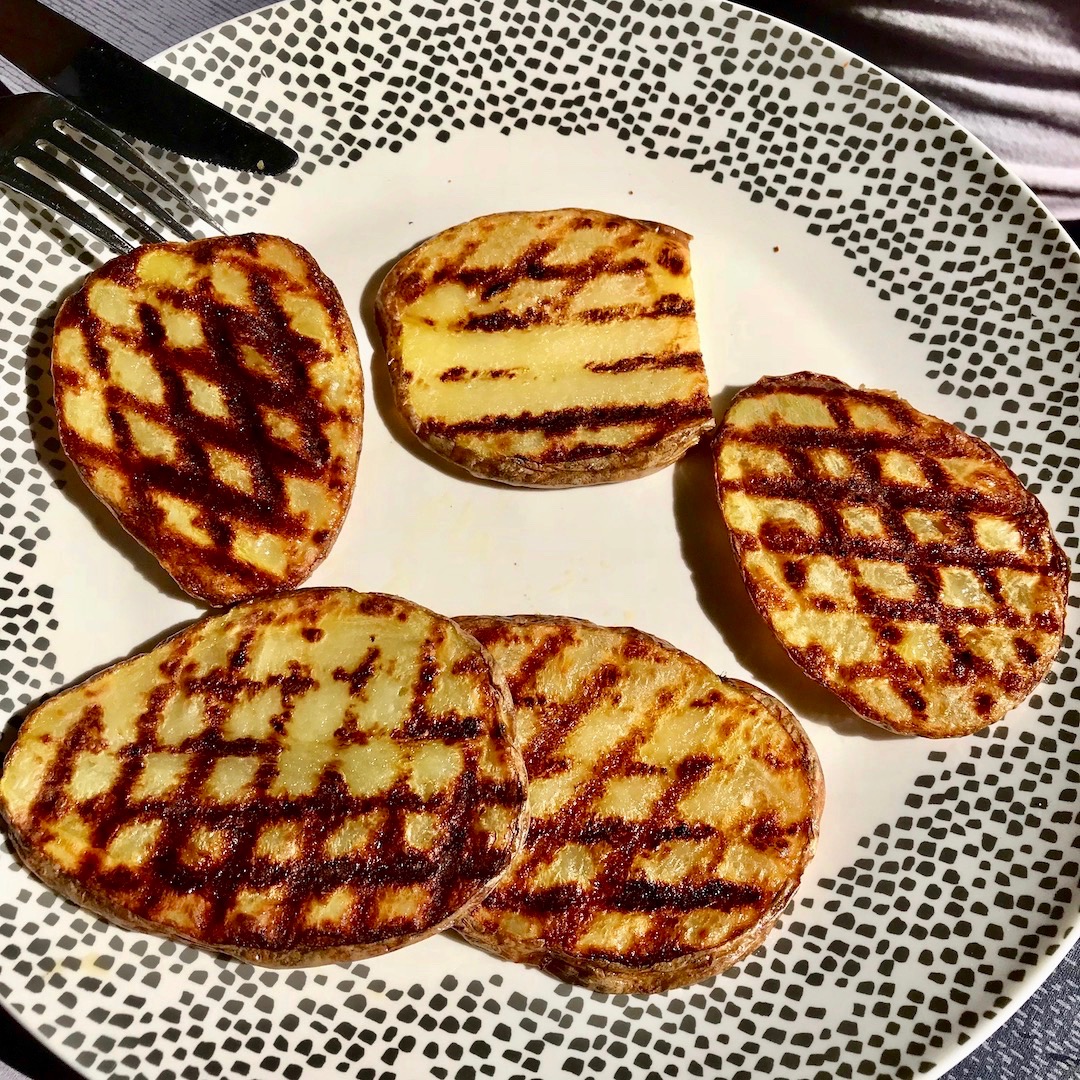 Ziemniaki z grilla przyrządzam zawsze z talarków wykrojonych z obranych surowych ziemniaków. Używam ziemniaków różnego gatunku i jak do tej pory za każdym razem moje ziemniaki wychodziły fantastycznie. Takie talarki surowych ziemniaków smaruję dość obficie oliwą, a następnie grilluję na ruszcie elektrycznym. Ziemniaki z grilla podaję od razu po upieczeniu razem z masłem czosnkowym, solą morską, a także suszonym oregano. To idealny posiłek na mały głód. Tak przygotowane ziemniaki zachwycają smakiem, o czym decyduje masło czosnkowe oraz suszone oregano. Dodatek gruboziarnistej soli morskiej smaku tego również dodaje.