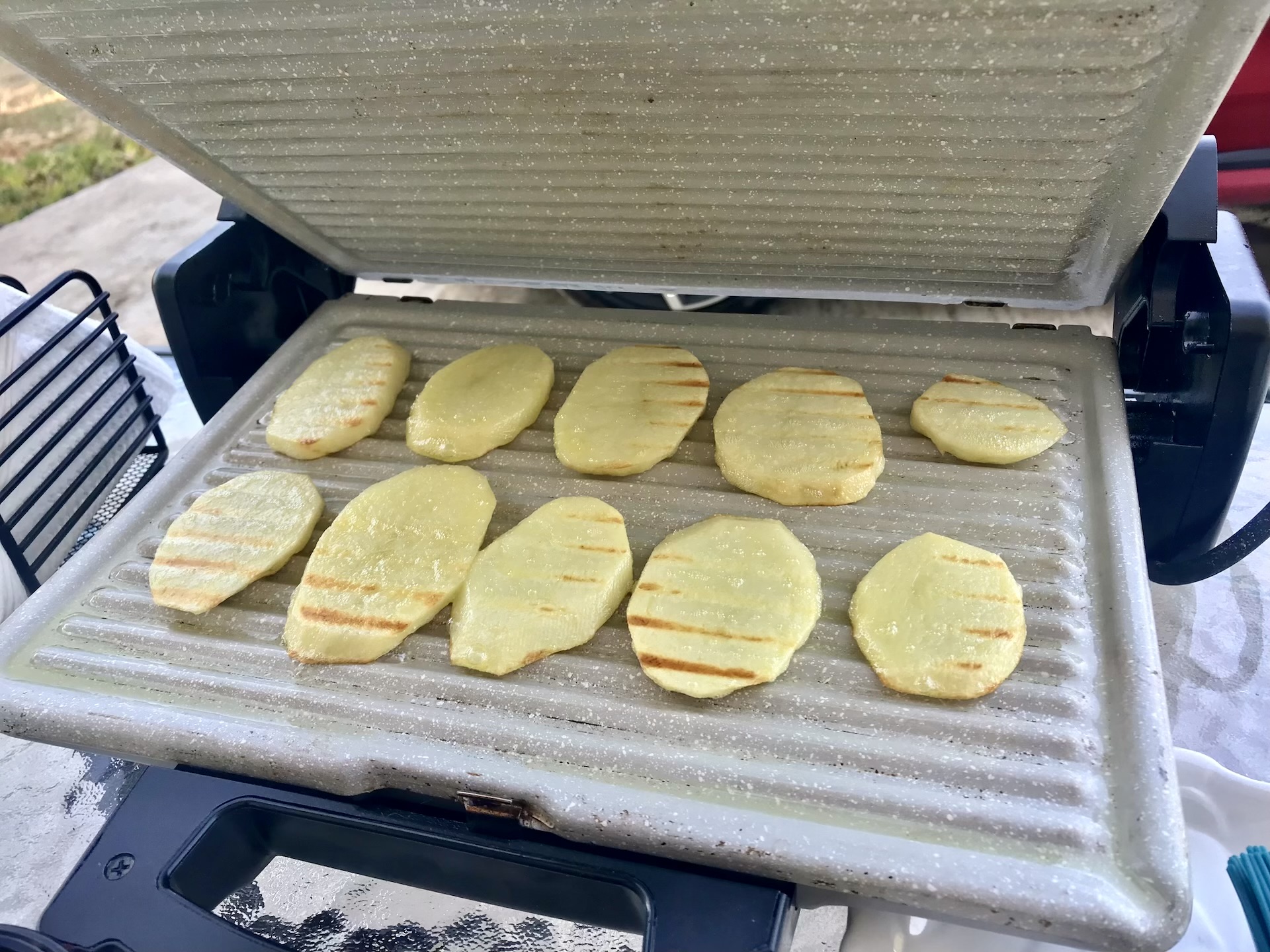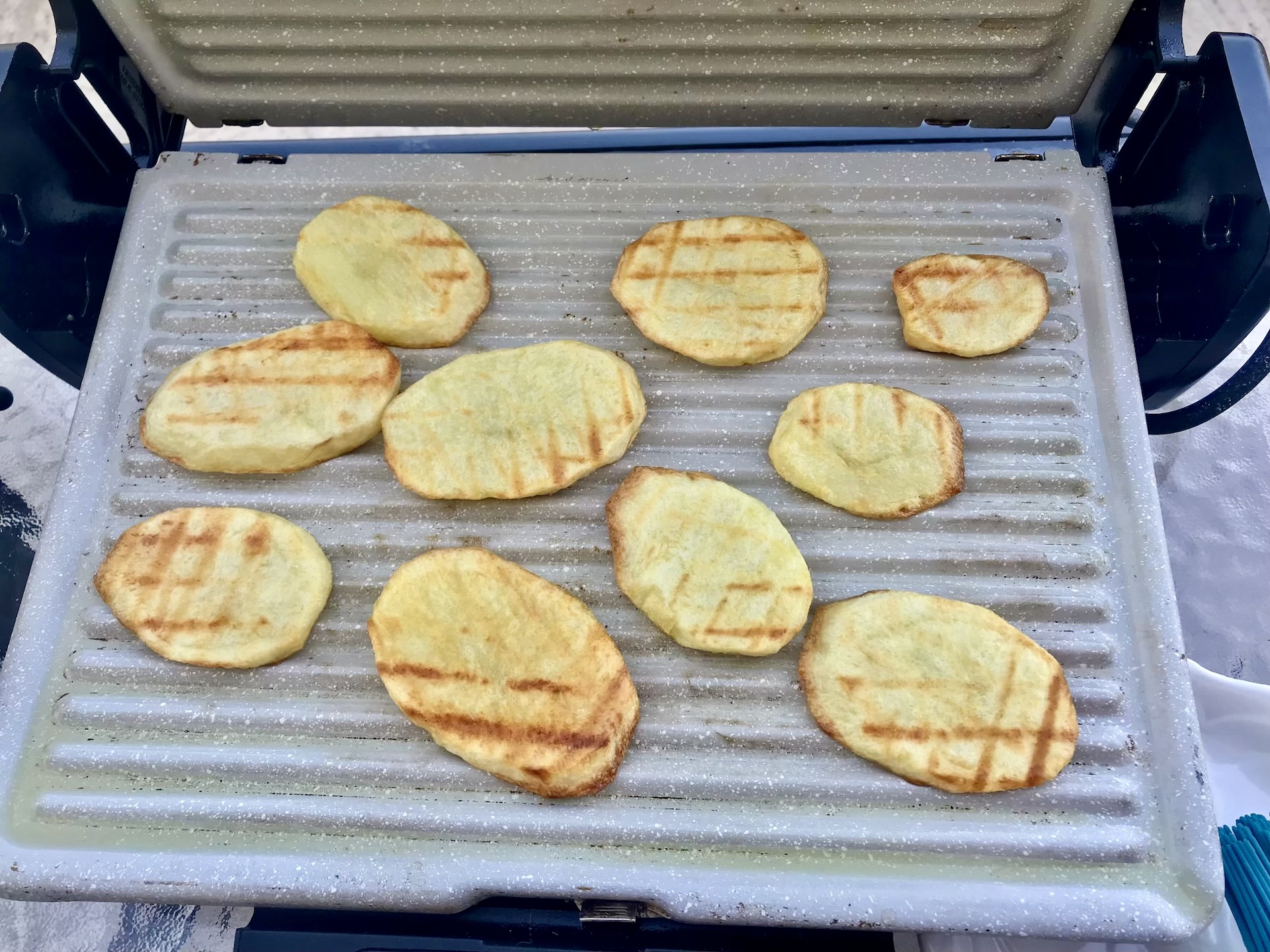 Autor poleca użycie grilla elektrycznego, co zapobiega wpadaniu talarków do ognia i pozwala na równomierne opiekanie z obu stron jednocześnie (jeśli grill jest zamykany).