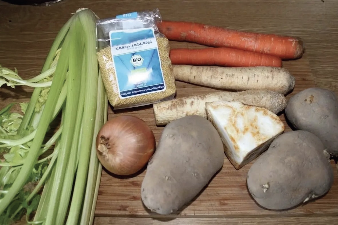 Warzywa: 3 duże ziemniaki, 2 marchewki, 1 pietruszka, kawałek korzenia selera, 1 łodyga selera naciowego, 1 duża cebula, 1-2 ząbki czosnku.