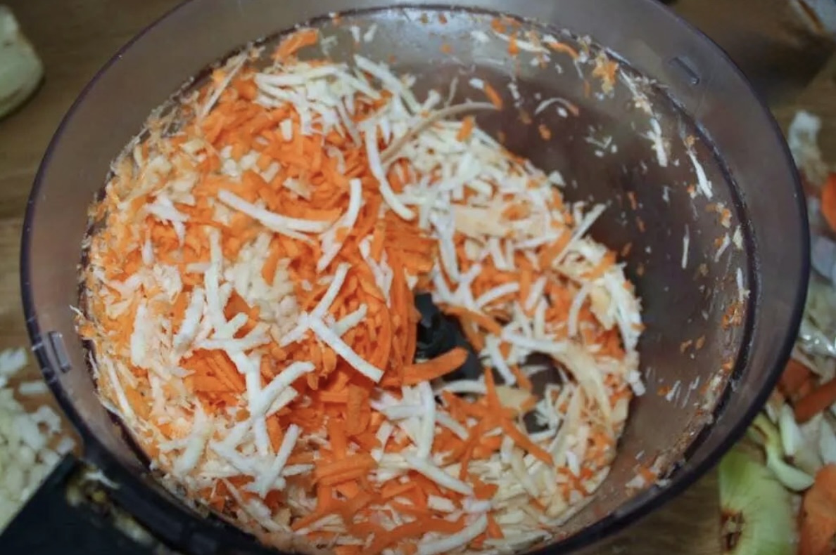 Marchewkę, pietruszkę i korzeń selera zetrzyj na dużych oczkach tarki (lub w malakserze).